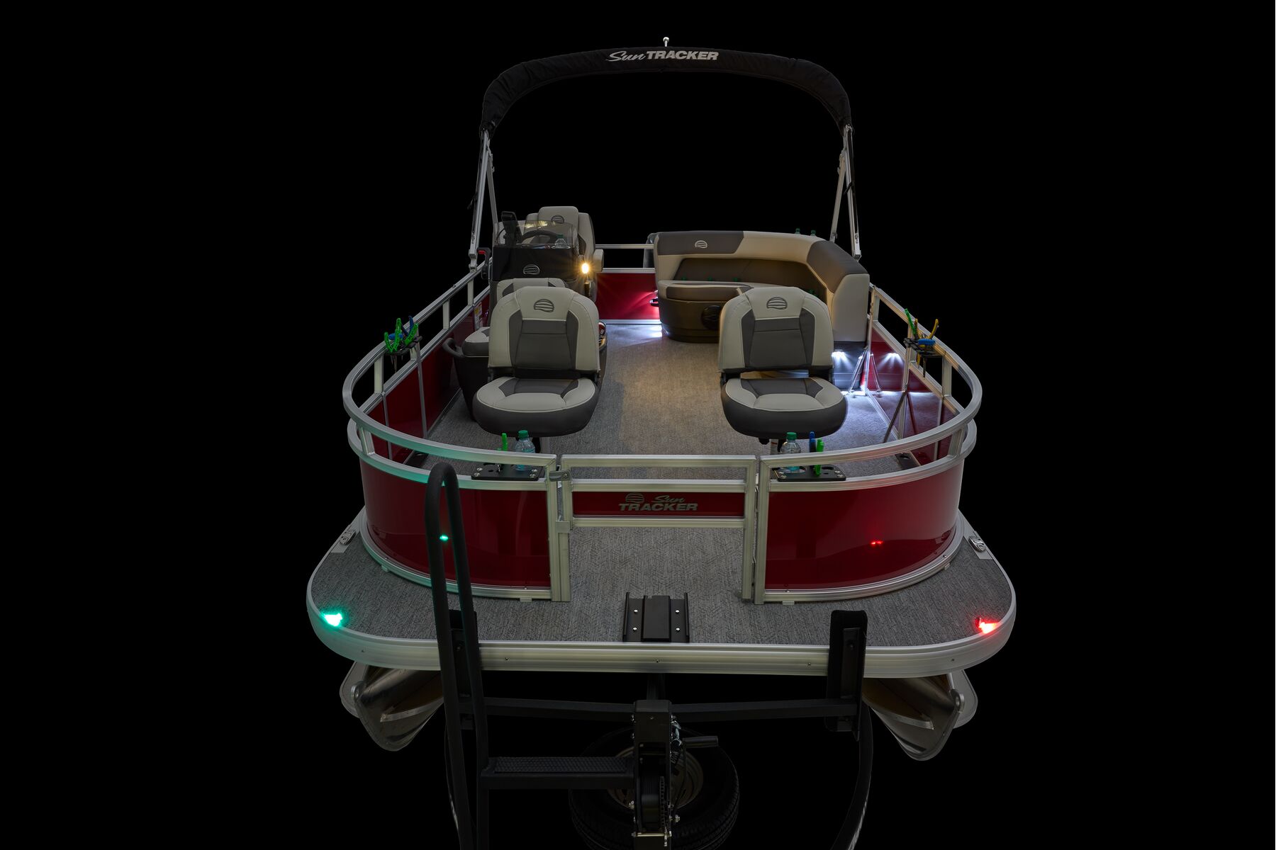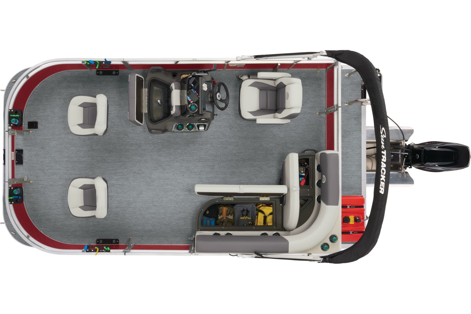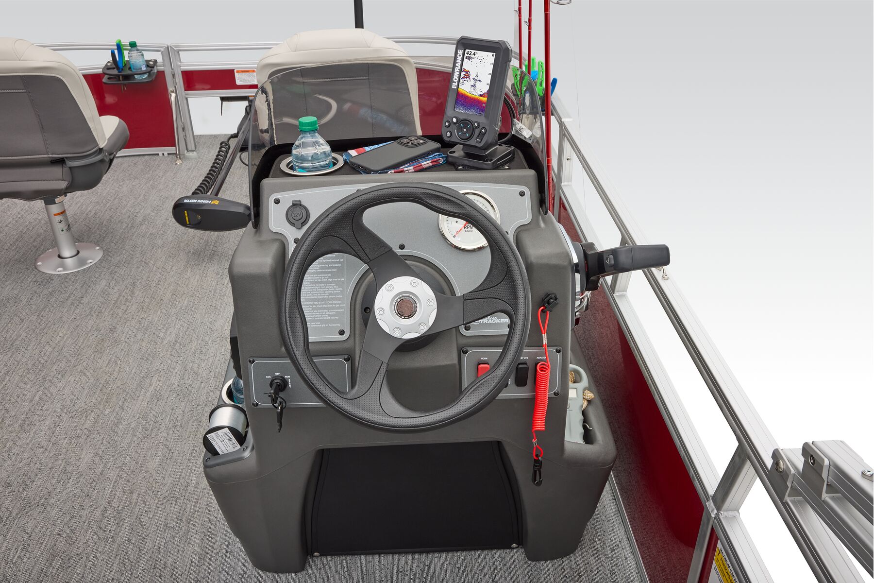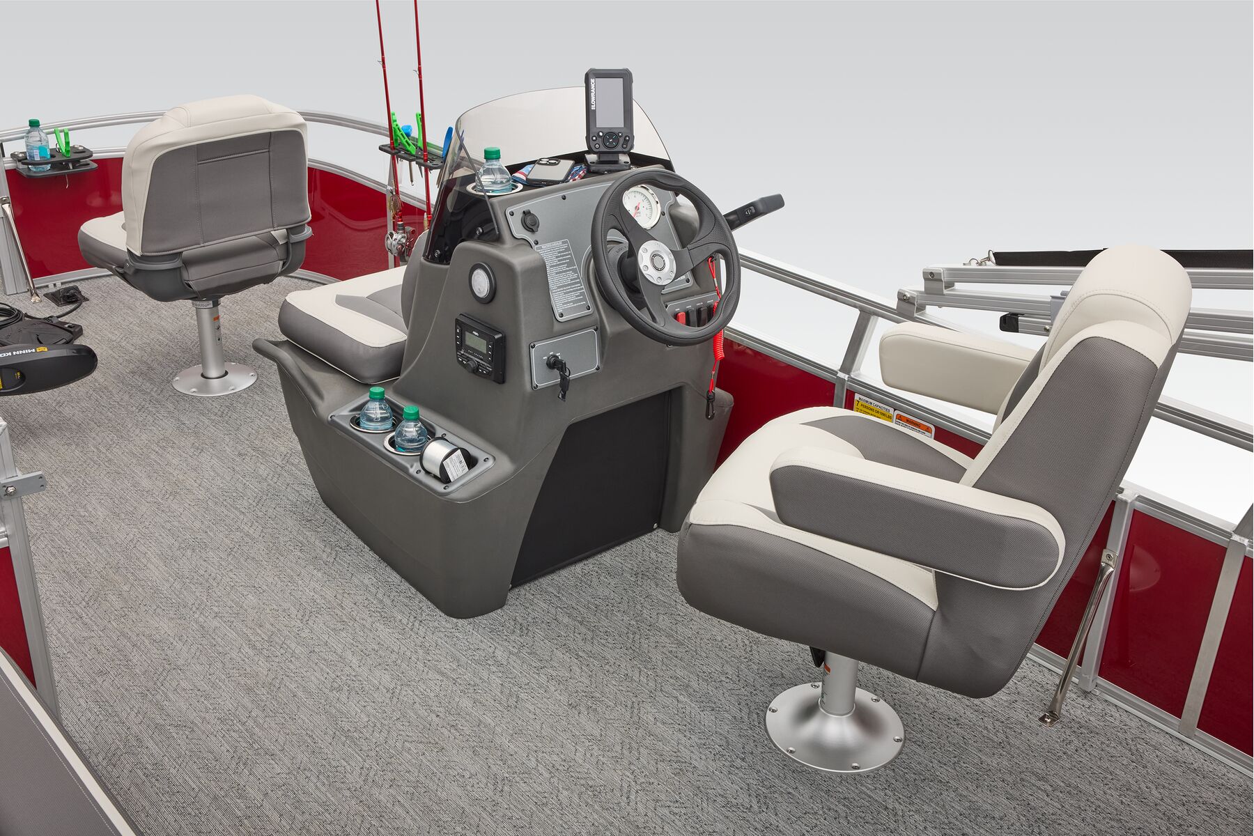 This seven-passenger fishing pontoon hits the water with new console and lounge designs. Get three extra cubic feet of storage thanks to clever backrest cut-outs. The redesign also adds a seat in front of the driver console, phone compartments, and four more cupholders. Cast from the shade of a standard 7' bimini top in one of the two folding fishing seats. Find your spot on the lake from the decked-out driver console, which comes with its own rod holder.
