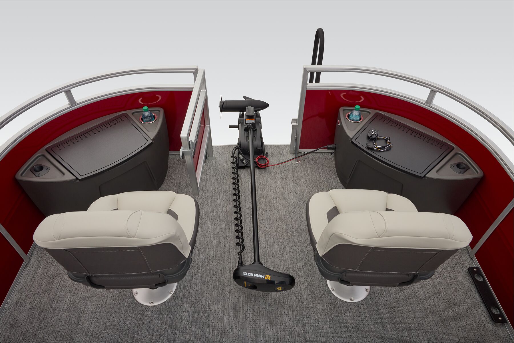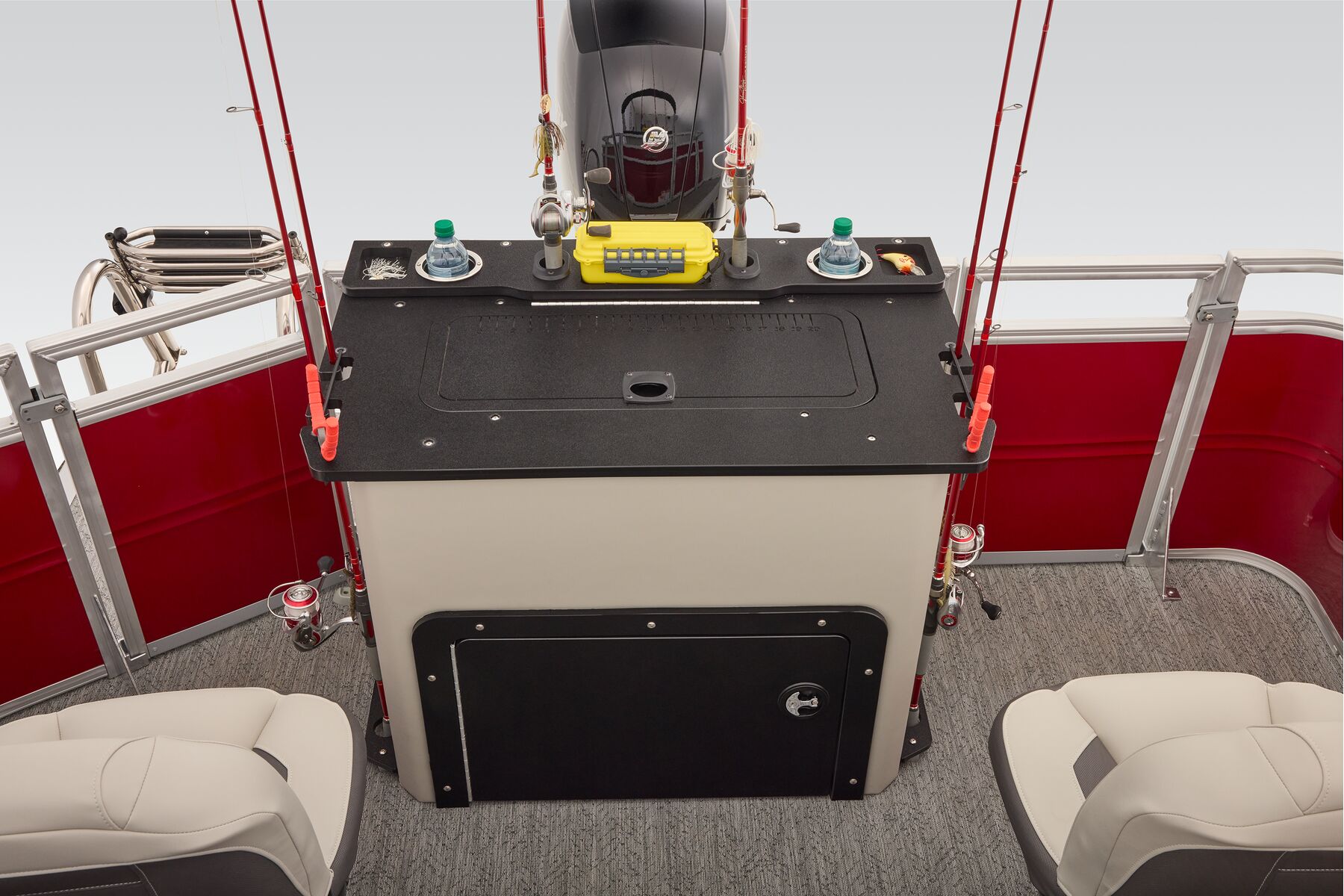 The FISHIN’ BARGE 22 DLX’s long list of features begins with 32 gallons of livewell capacity spread out between the fore and aft fishing decks. Both of those decks sport two foldable fishing chairs with pedestal bases. Their rail-mounted rod and tool holders—as well as the aft lockable rod box—keep everything you need at hand.
