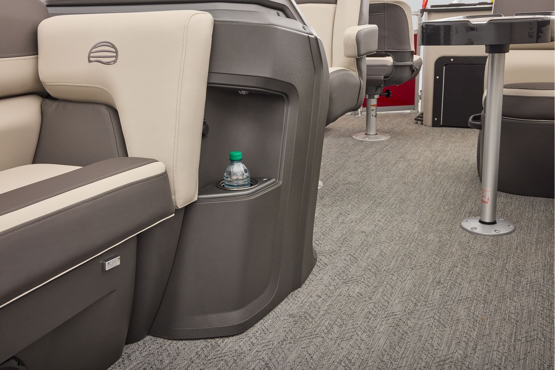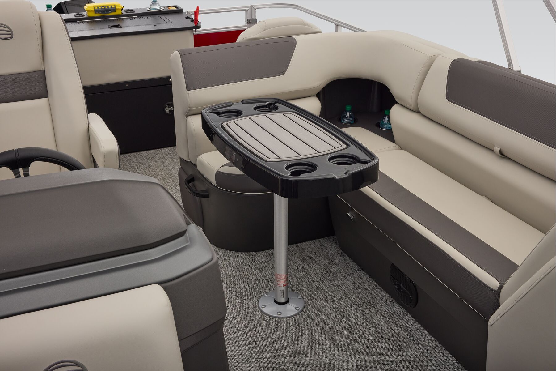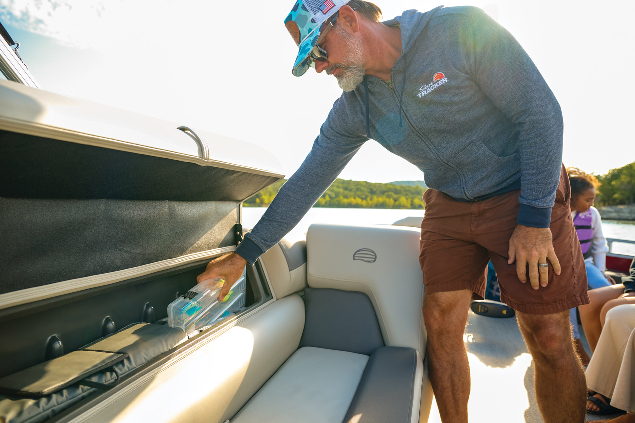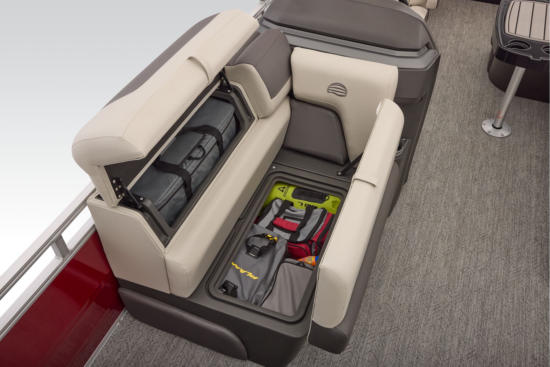 You can keep your other supplies in the hidden under-seat and seat-back STOW MORE™ compartments. The 2026 model adds improved storage built right into the lounge's backrest that includes extra cupholders and space for more gear. Between the removable table, the 10' bimini top, the brand-new boarding ladder with wider steps, and the Bluetooth®-capable stereo, your lake days are covered.