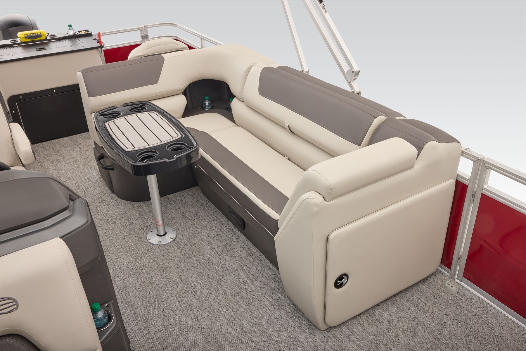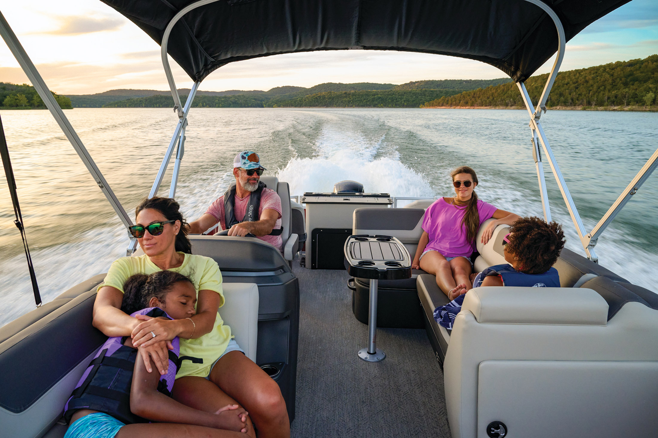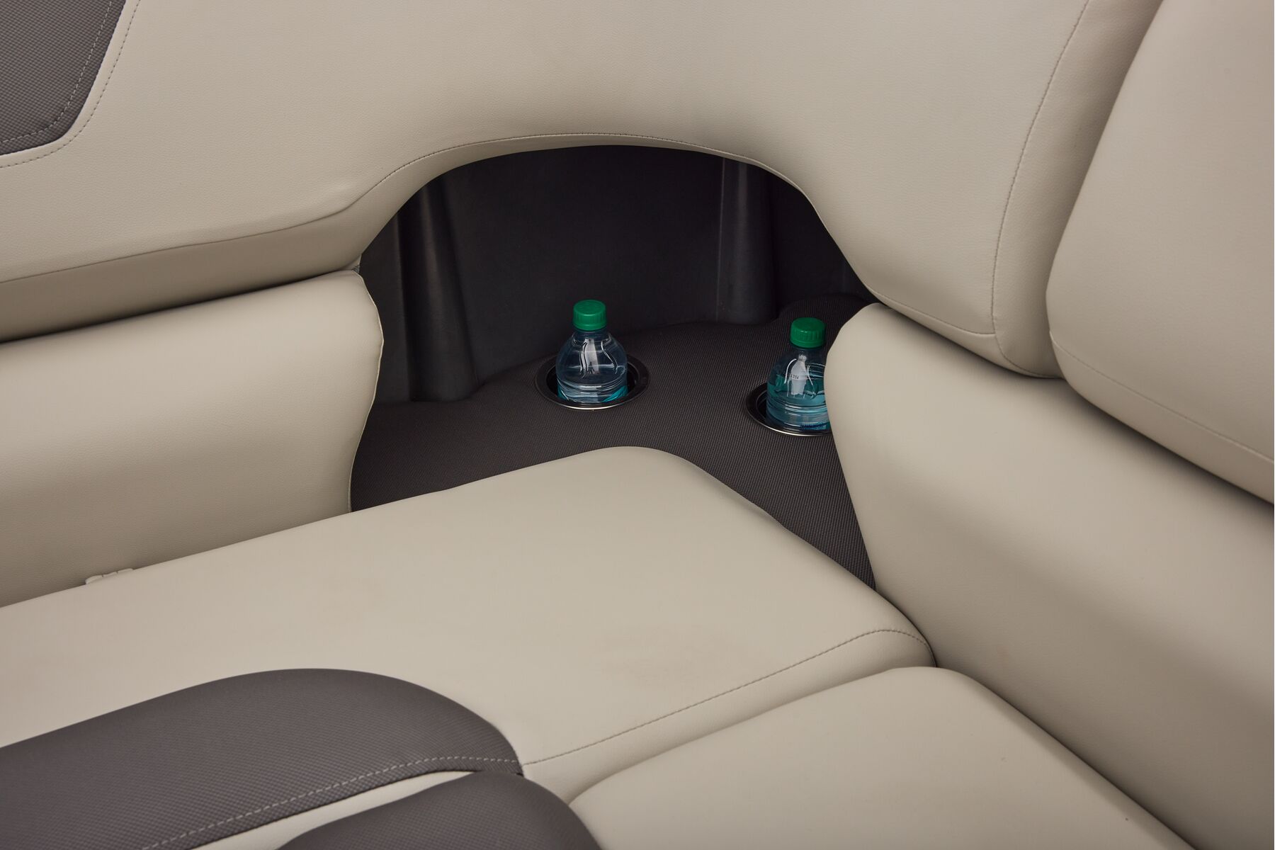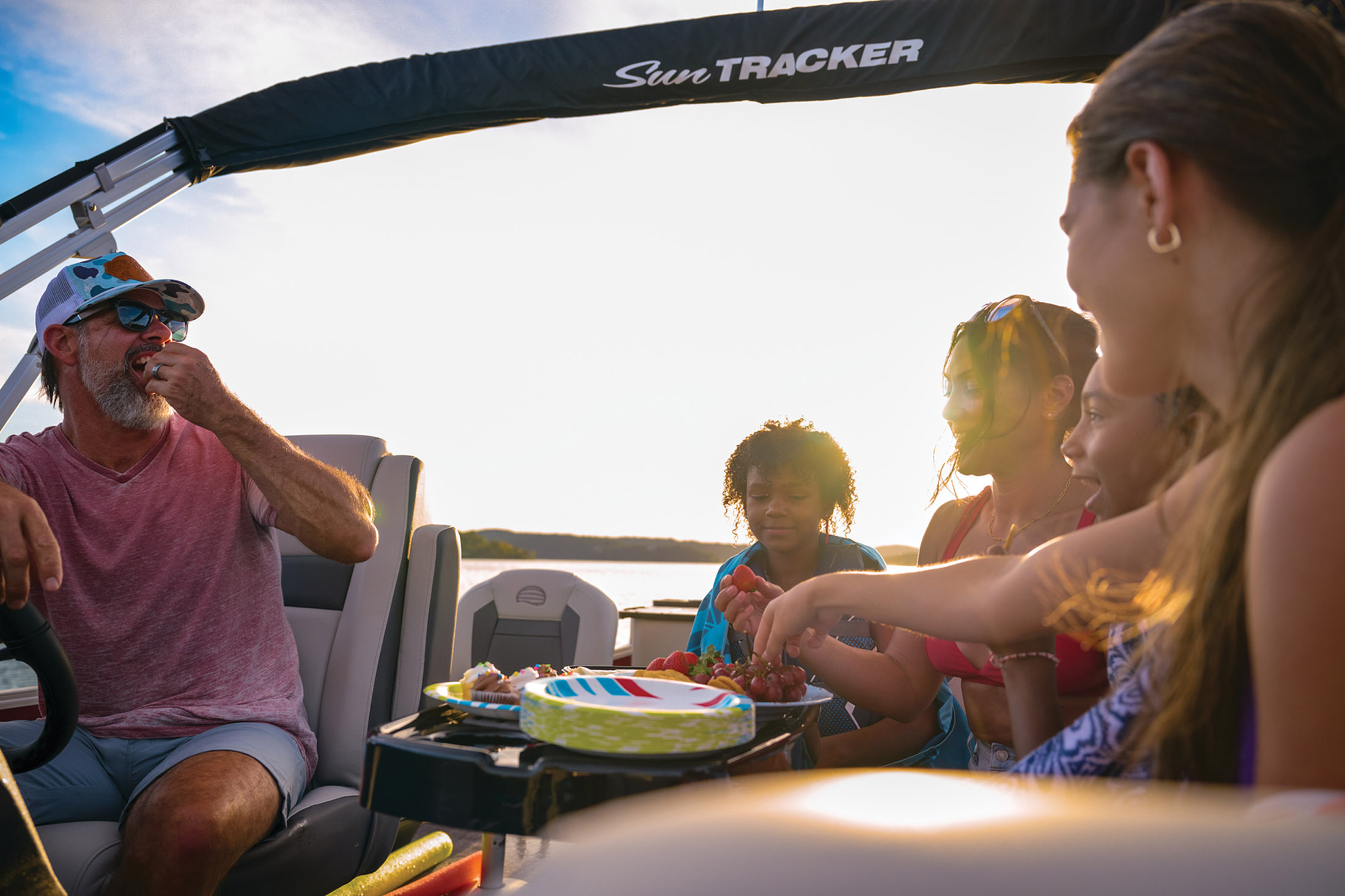 You can keep your other supplies in the hidden under-seat and seat-back STOW MORE™ compartments. The 2026 model adds improved storage built right into the lounge's backrest that includes extra cupholders and space for more gear. Between the removable table, the 10' bimini top, the brand-new boarding ladder with wider steps, and the Bluetooth®-capable stereo, your lake days are covered.