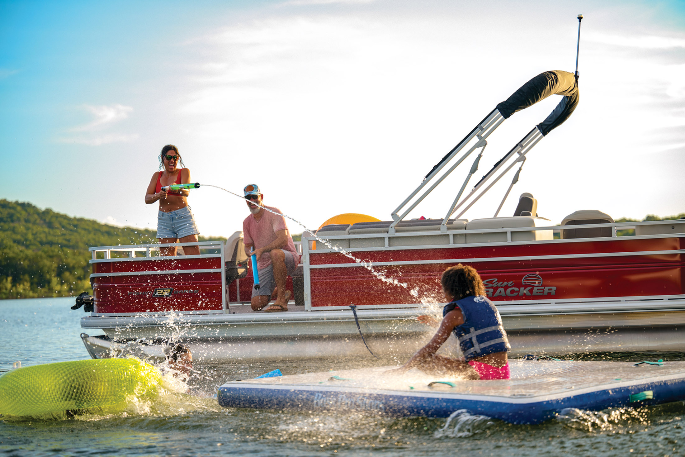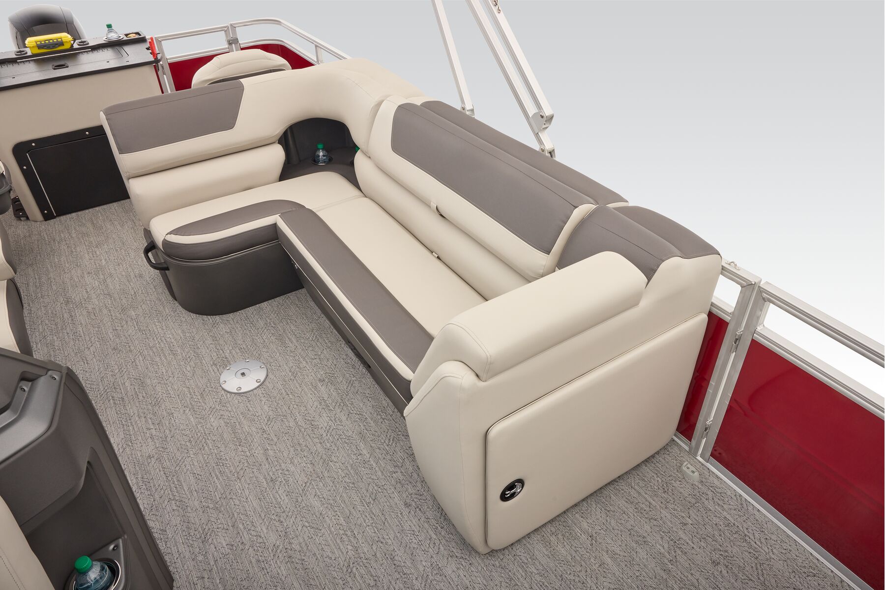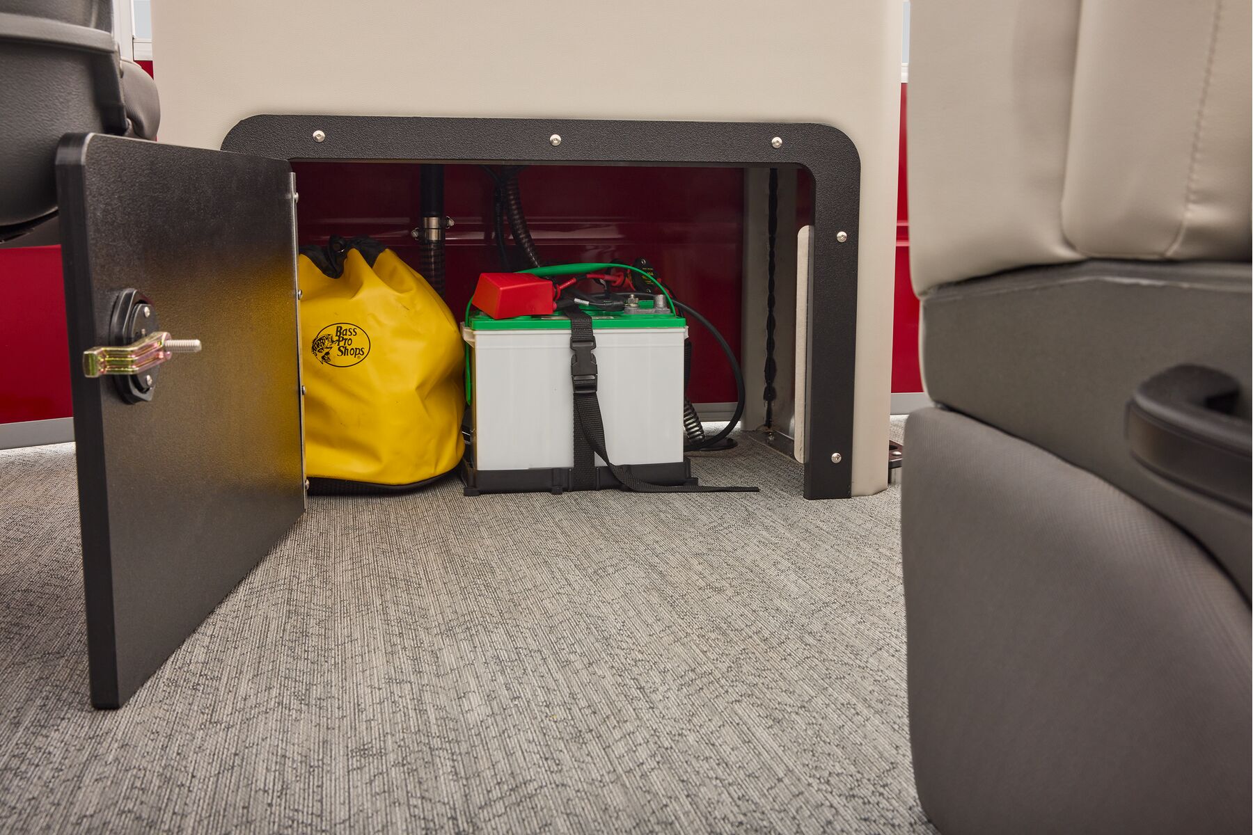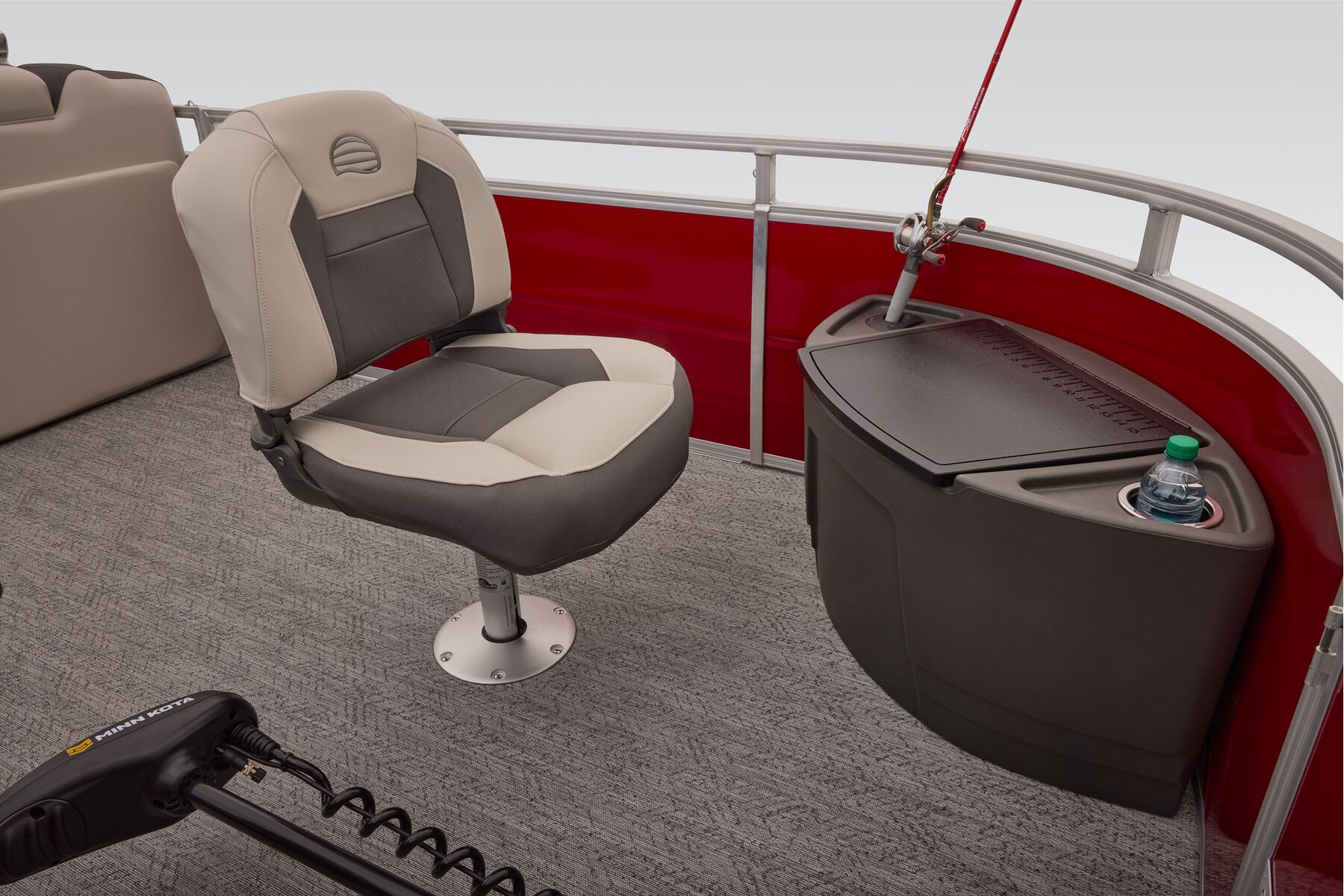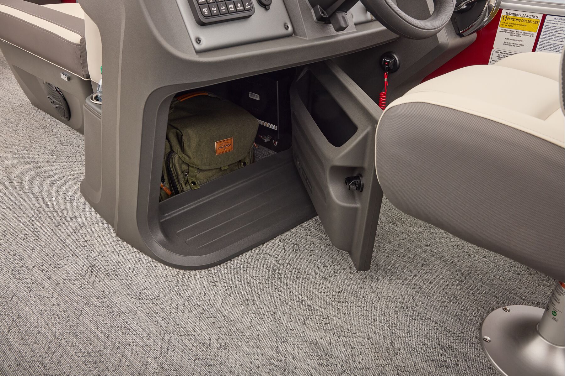 You can keep your other supplies in the hidden under-seat and seat-back STOW MORE™ compartments. The 2026 model adds improved storage built right into the lounge's backrest that includes extra cupholders and space for more gear. Between the removable table, the 10' bimini top, the brand-new boarding ladder with wider steps, and the Bluetooth®-capable stereo, your lake days are covered.