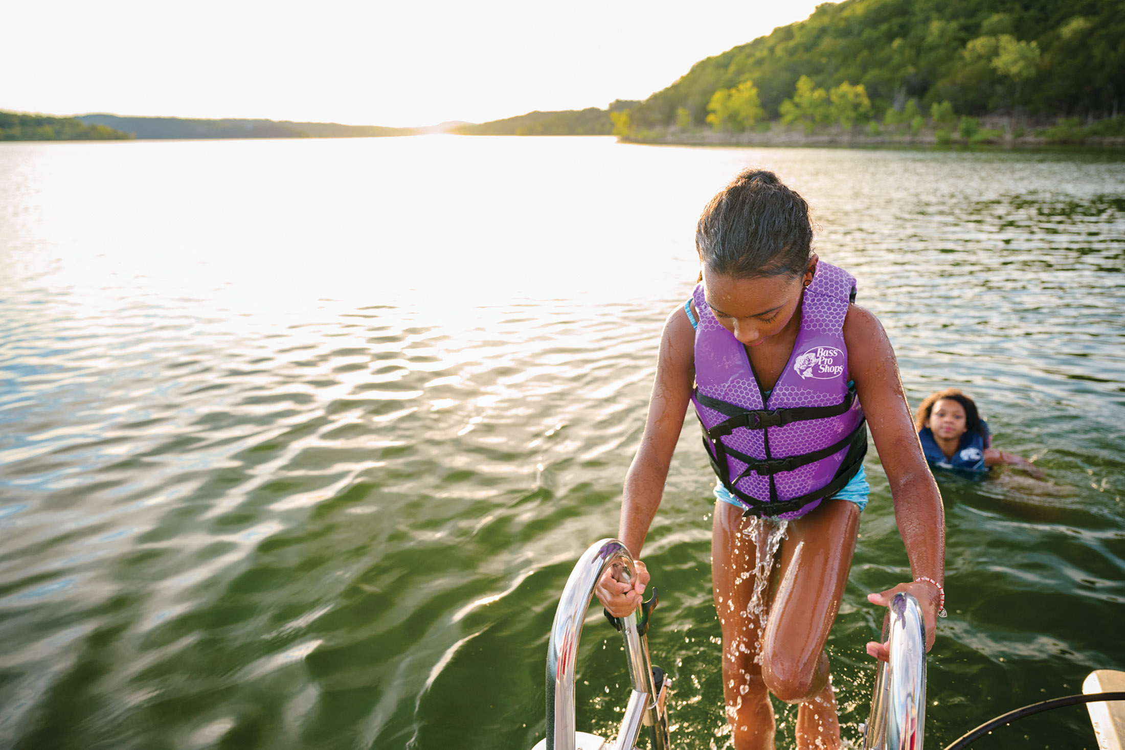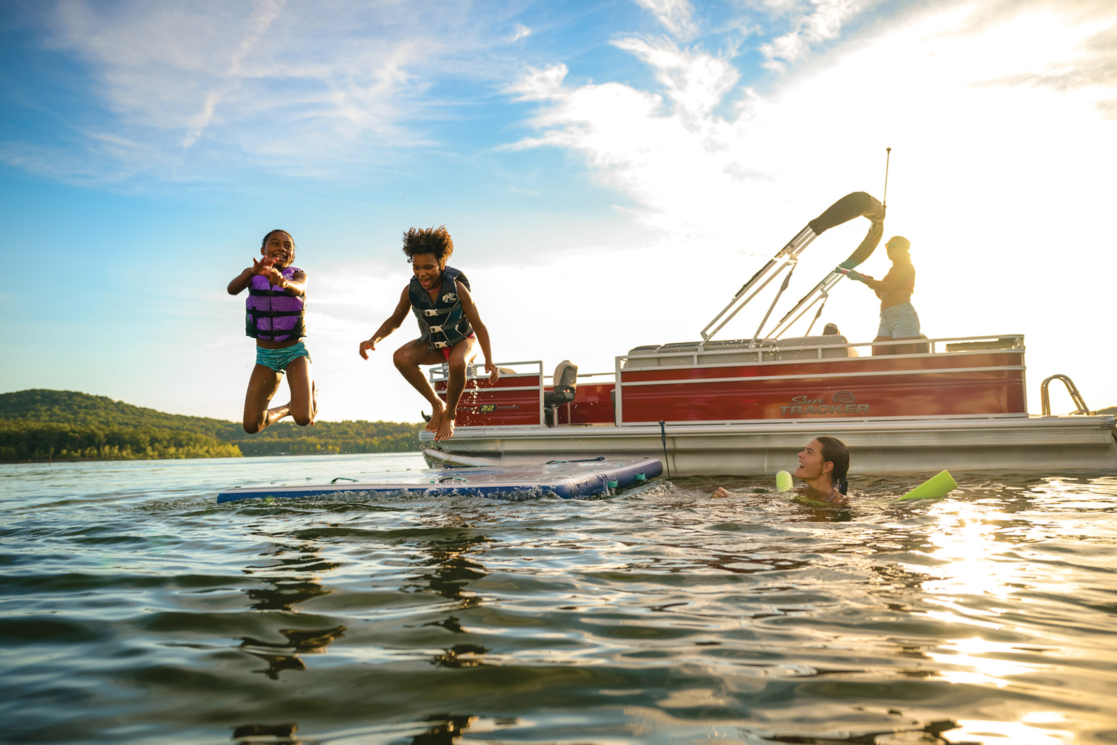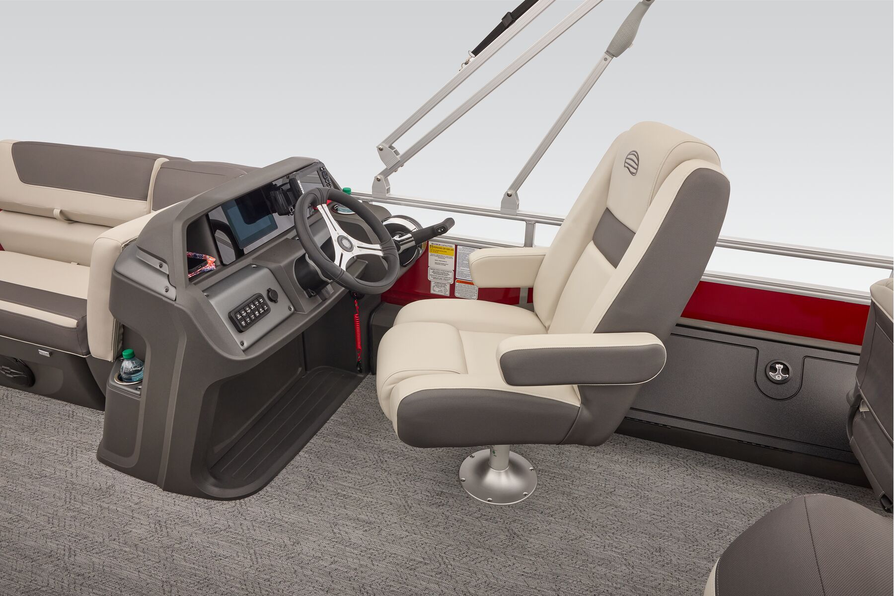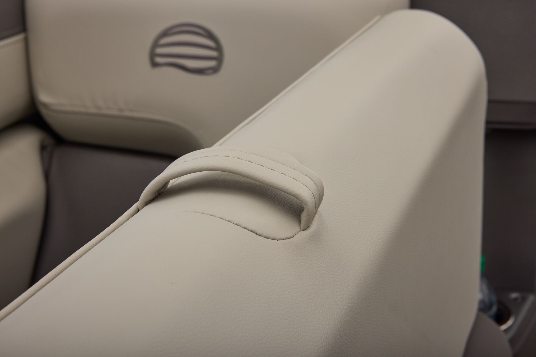 You can keep your other supplies in the hidden under-seat and seat-back STOW MORE™ compartments. The 2026 model adds improved storage built right into the lounge's backrest that includes extra cupholders and space for more gear. Between the removable table, the 10' bimini top, the brand-new boarding ladder with wider steps, and the Bluetooth®-capable stereo, your lake days are covered.