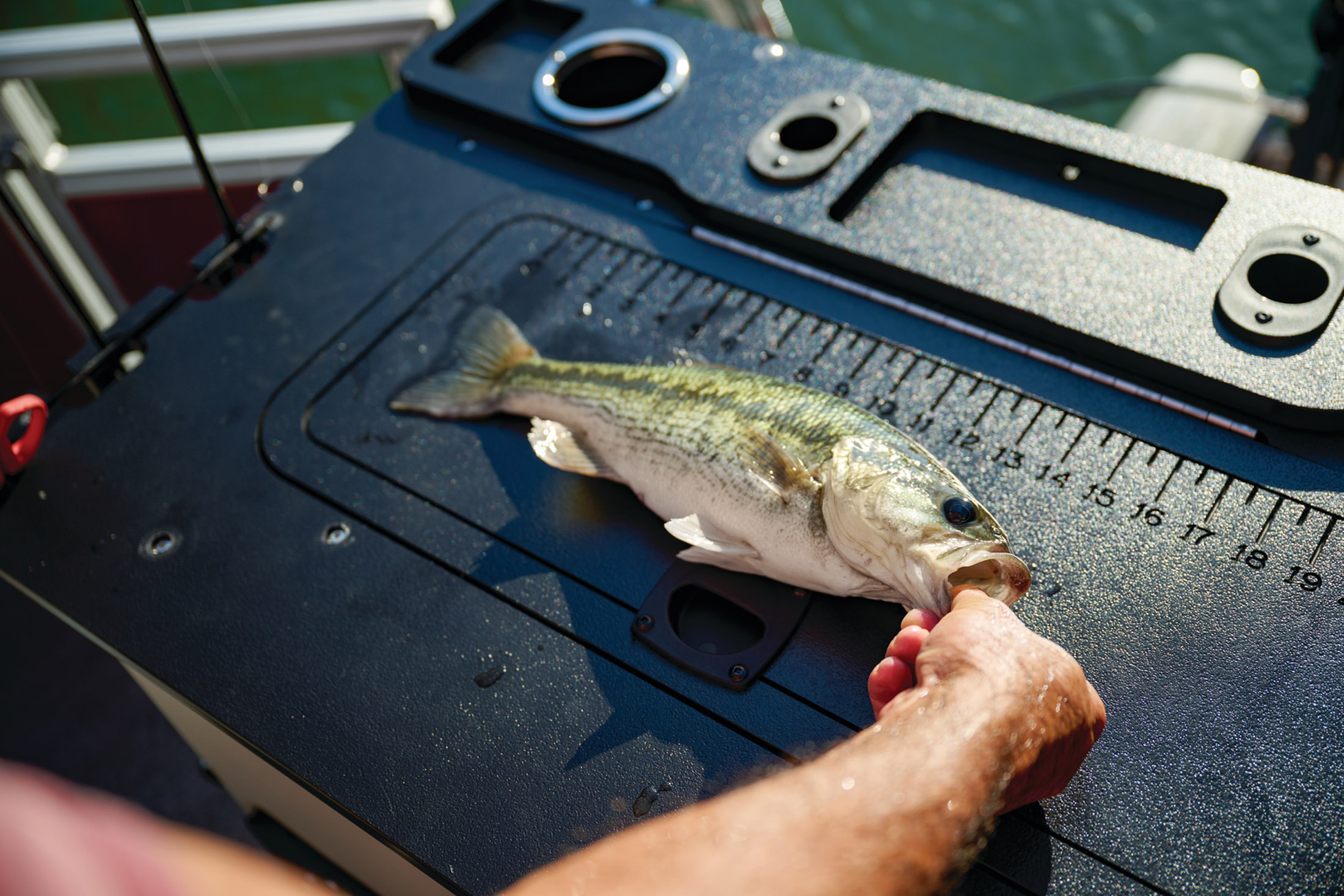 Bow 16-gal. and aft 15-gal. aerated livewells with shutoff valves, drink holders, rod holders, and composite lids with integrated fish rulers.