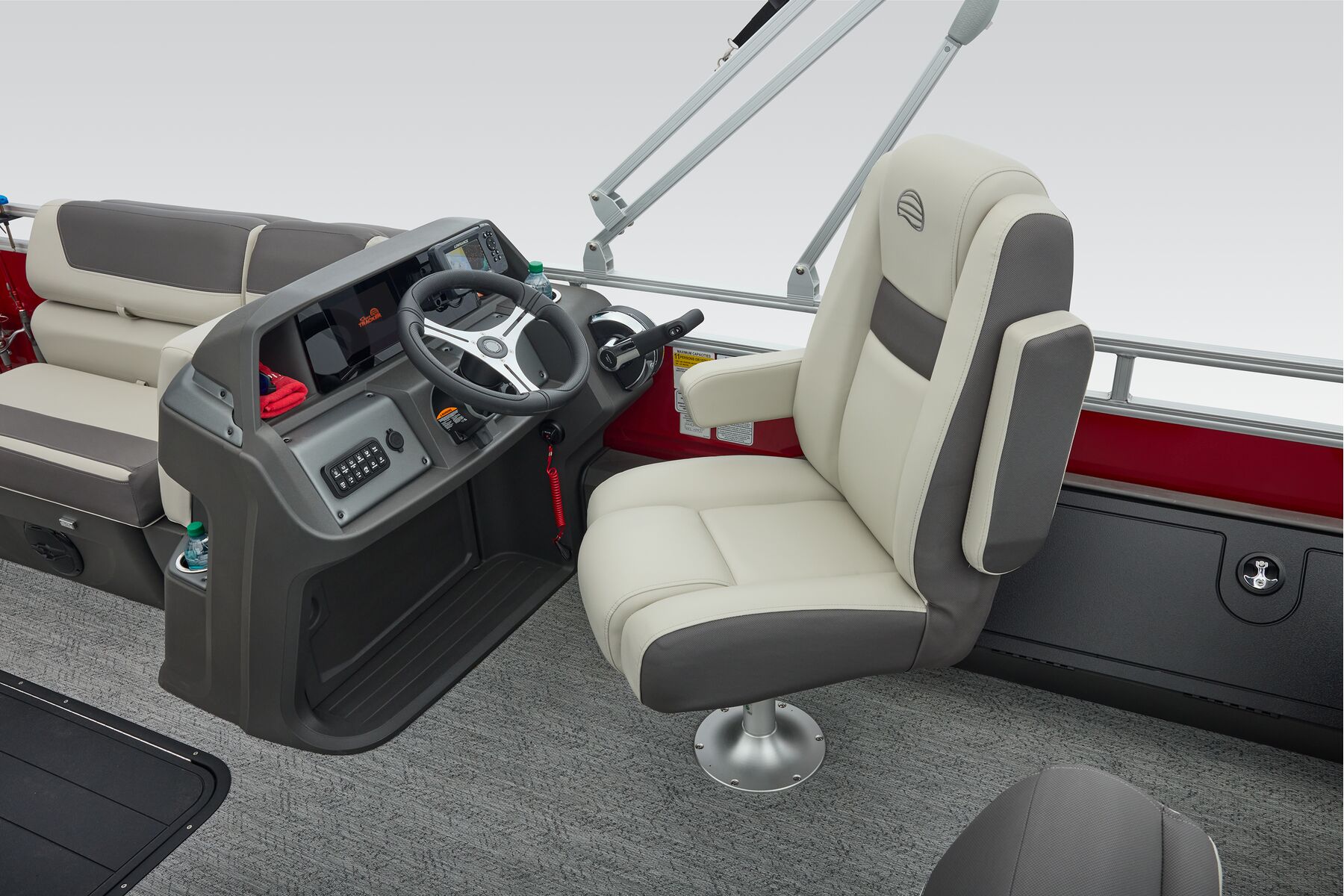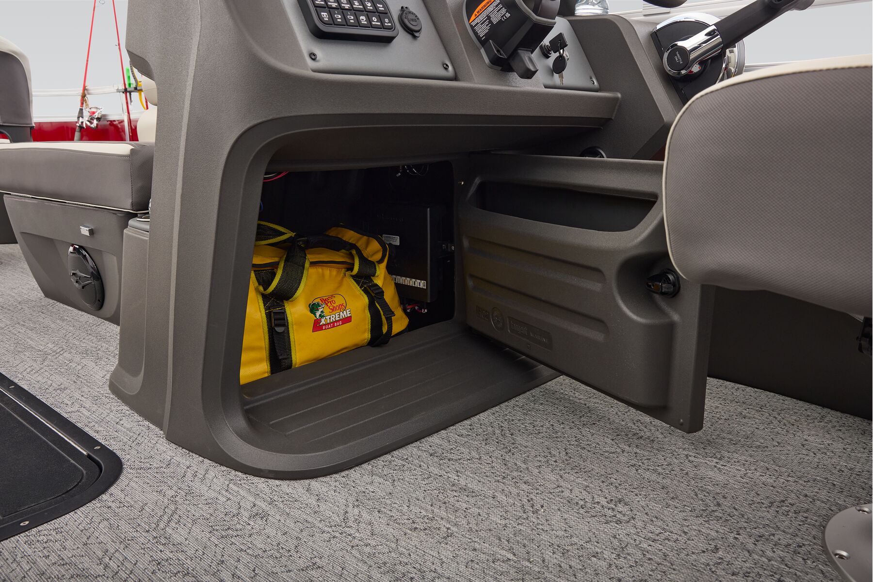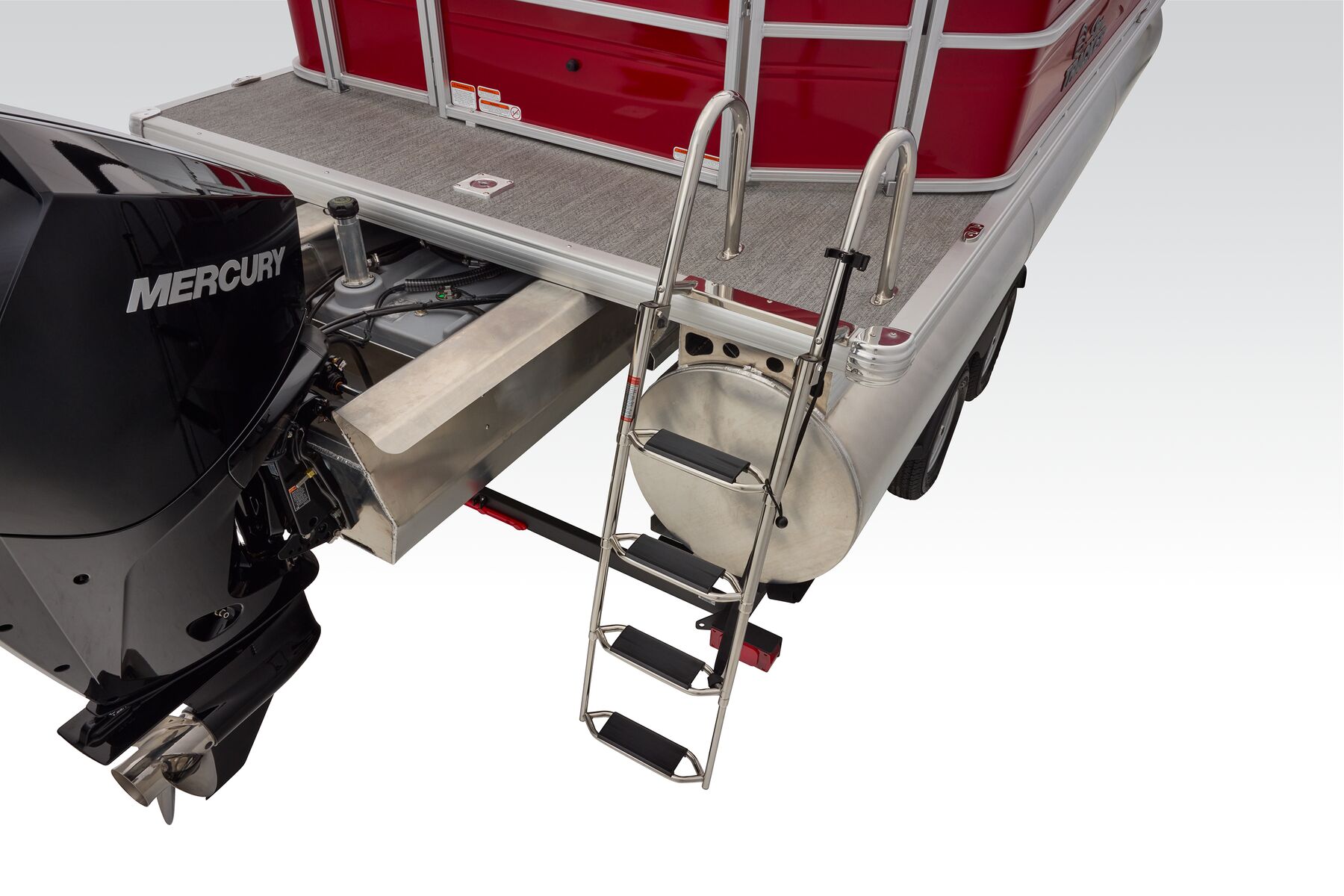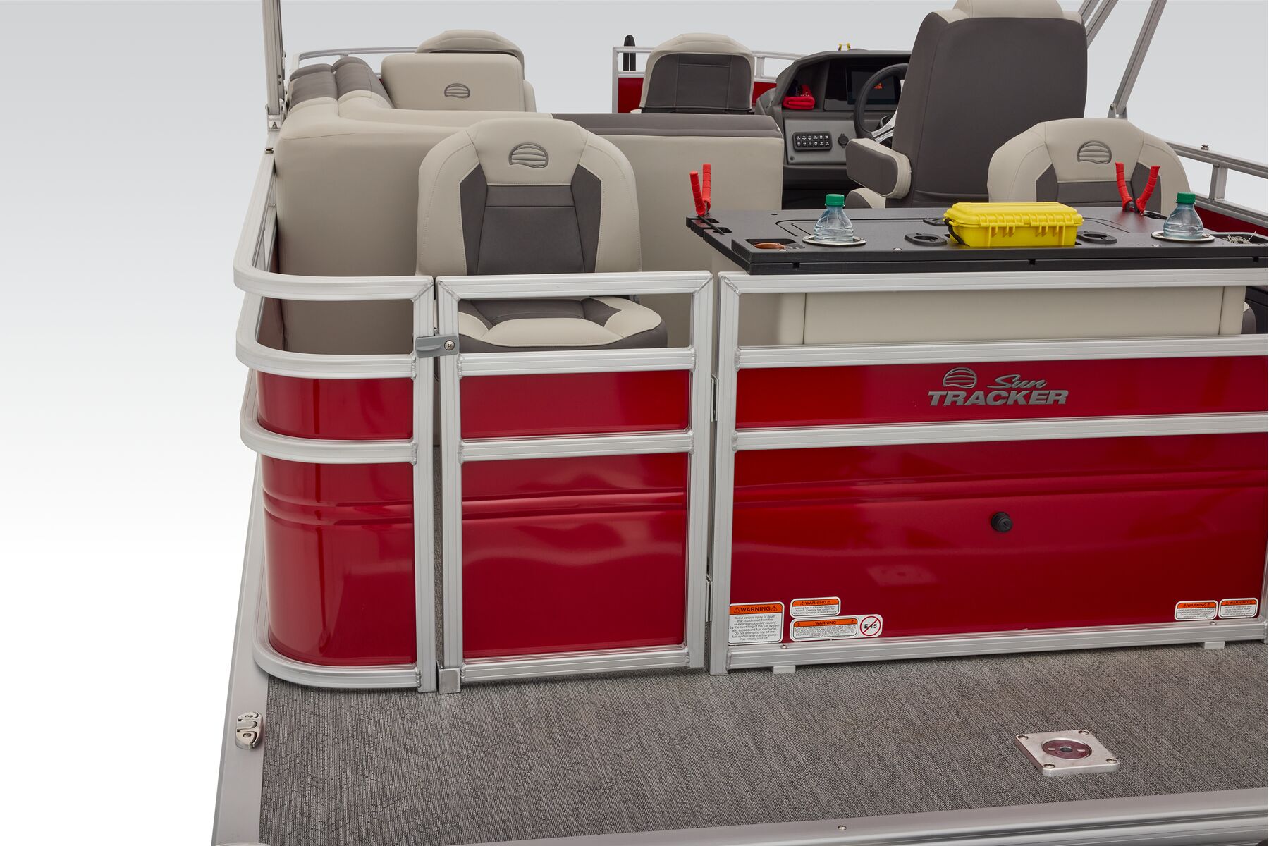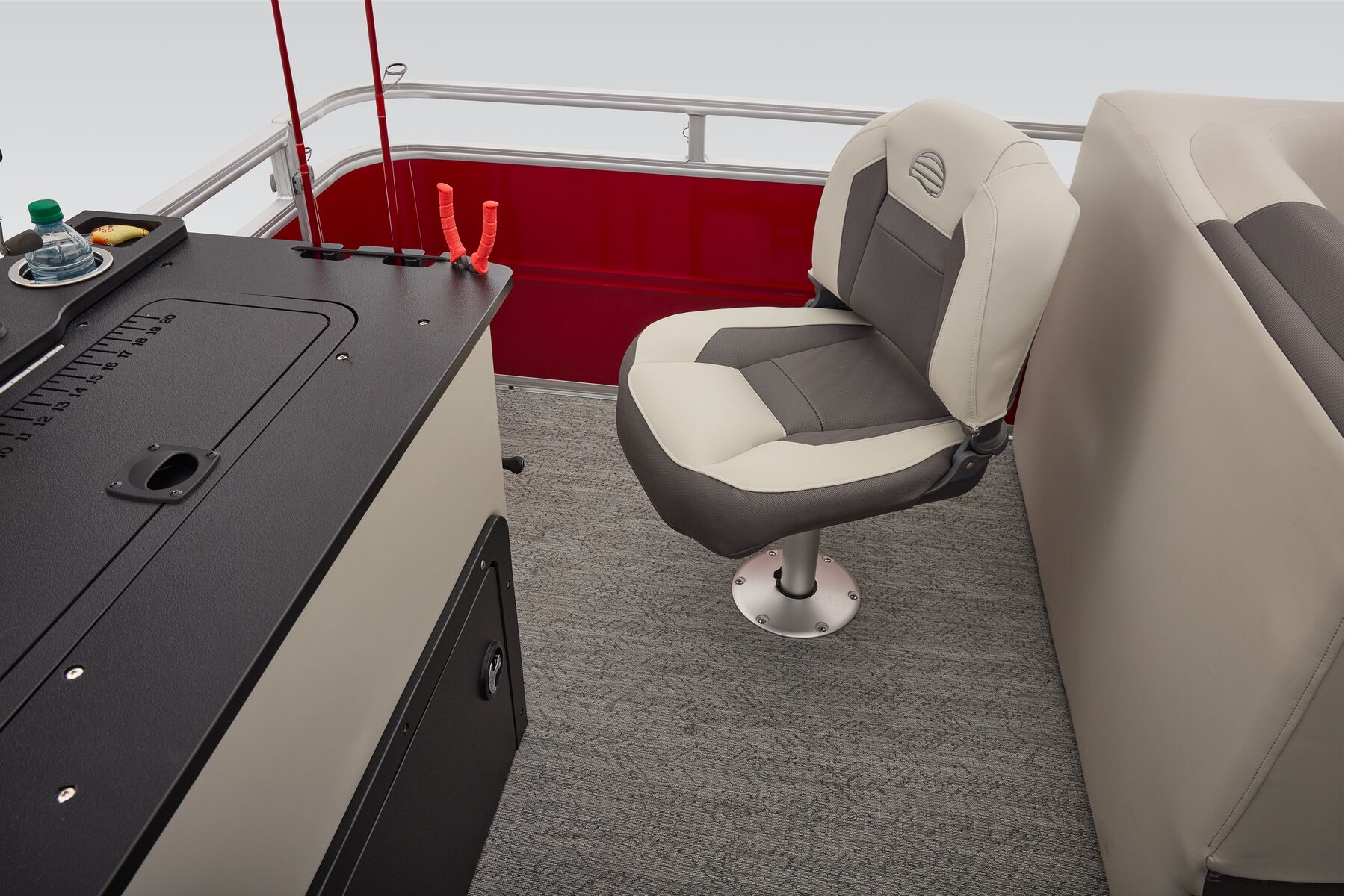Captains can control it all with the SUN TRACKER FLARE™ touch-screen gauge display. Set up the 10' bimini top, grab your rod out of the lockable rod box, and post up in one of the two fishing decks—each of which sports a 16-gal. aerated livewell—and two swiveling fishing chairs next to rod and tool holders. The dual lounges or aft bench with hidden storage are ready for relaxation. The lounges’ all-new open section in the backrest increases accessible storage and even has extra cupholders. 2026 also brings a wider, ergonomic boarding ladder.
