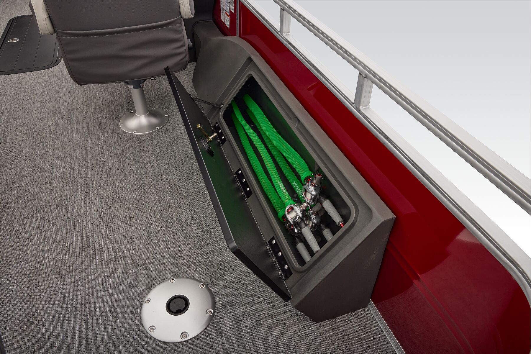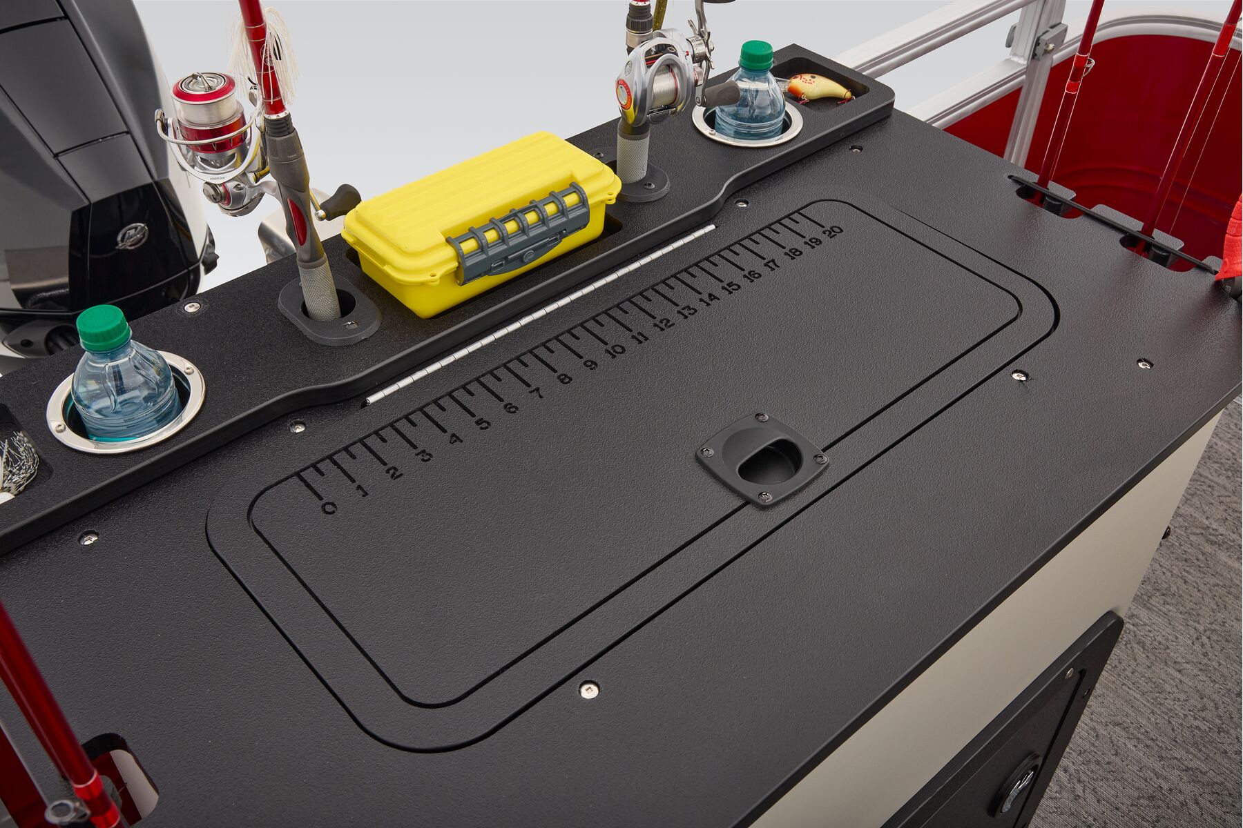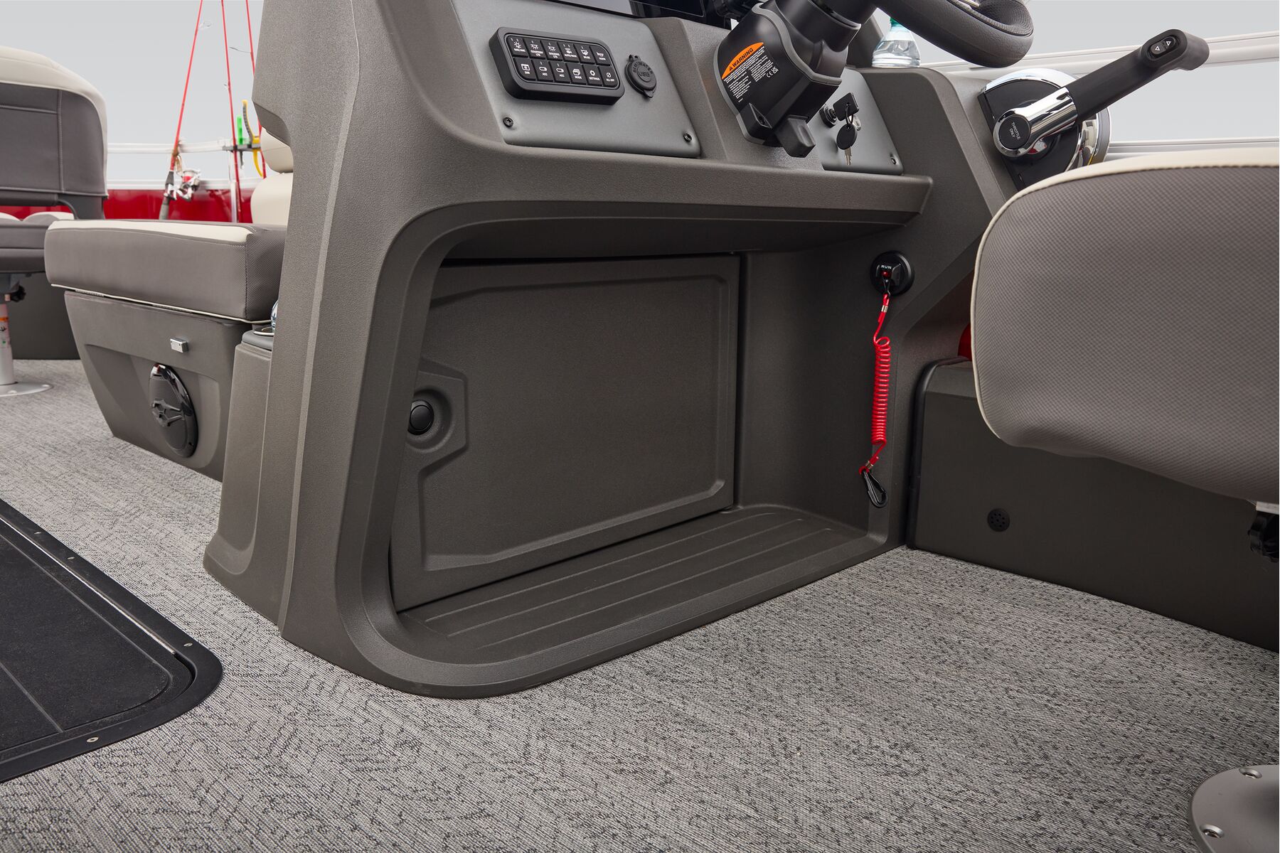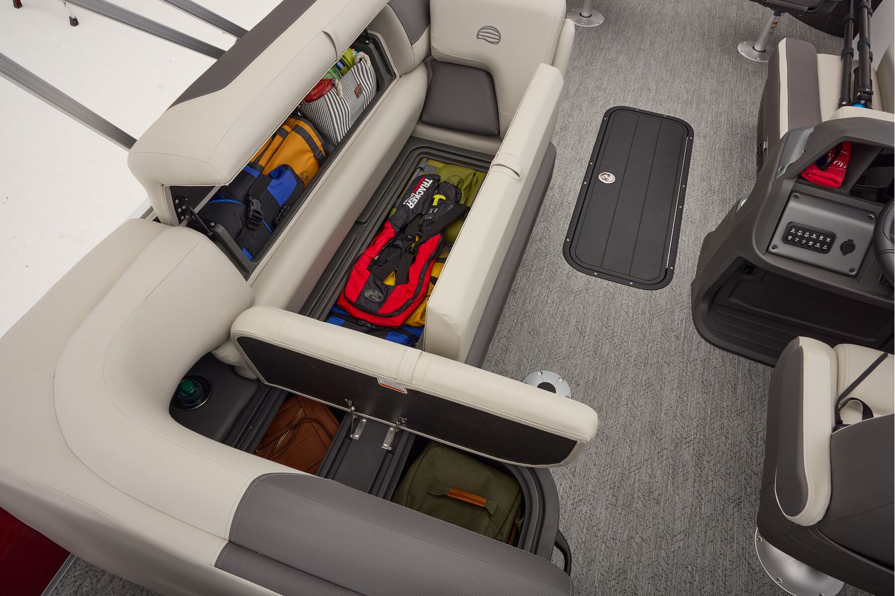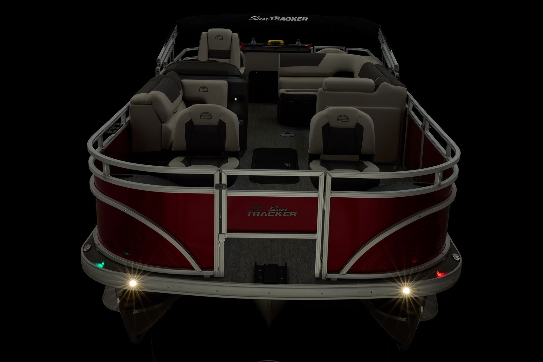 Captains can control it all with the SUN TRACKER FLARE™ touch-screen gauge display. Set up the 10' bimini top, grab your rod out of the lockable rod box, and post up in one of the two fishing decks—each of which sports a 16-gal. aerated livewell—and two swiveling fishing chairs next to rod and tool holders. The dual lounges or aft bench with hidden storage are ready for relaxation. The lounges’ all-new open section in the backrest increases accessible storage and even has extra cupholders. 2026 also brings a wider, ergonomic boarding ladder.