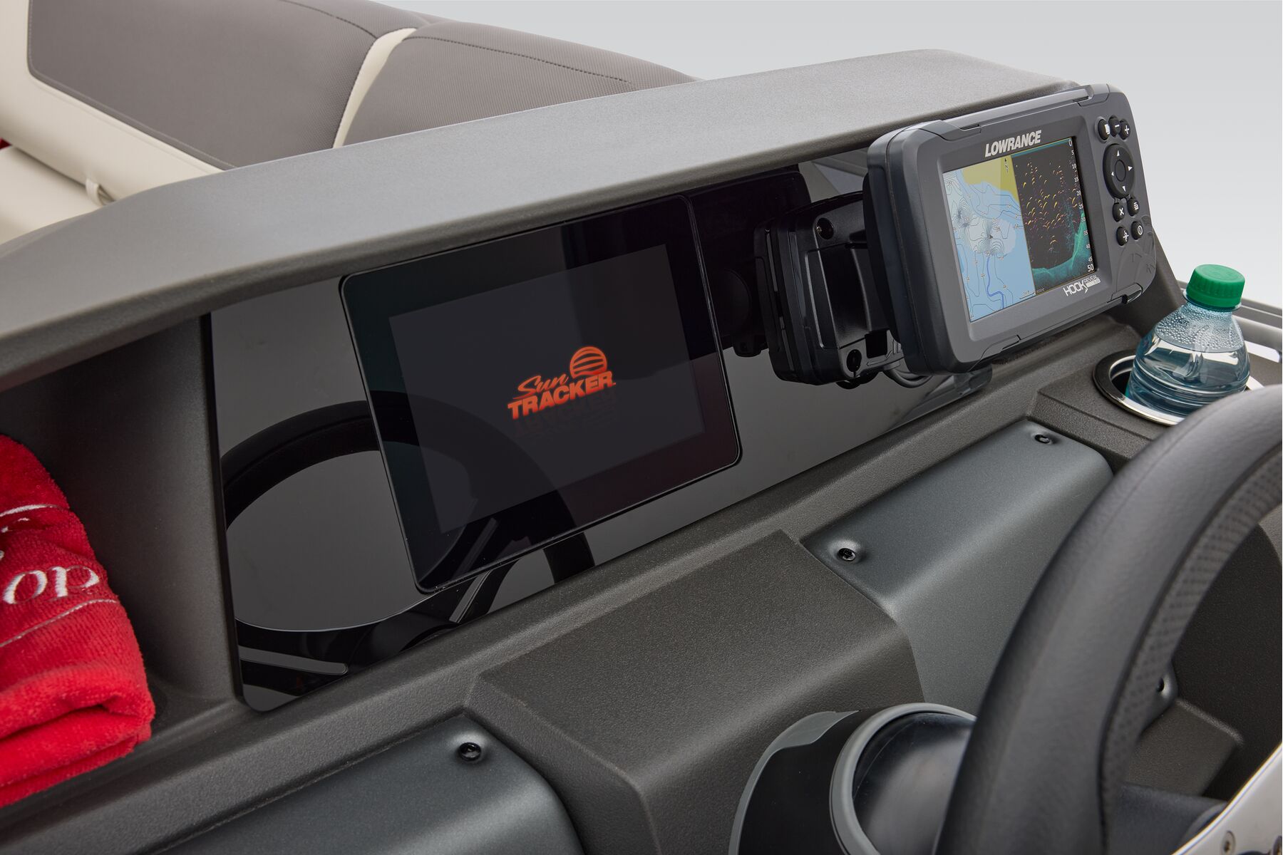 Note: SunTracker’s innovative new FLARE touchscreen gauge display relies on proprietary digital engine data not available from all engines. Boats equipped with optional Mercury 9.9ELPT FourStroke or 20ELPT FourStroke engines will experience limited monitoring capability. See dealer for details.
