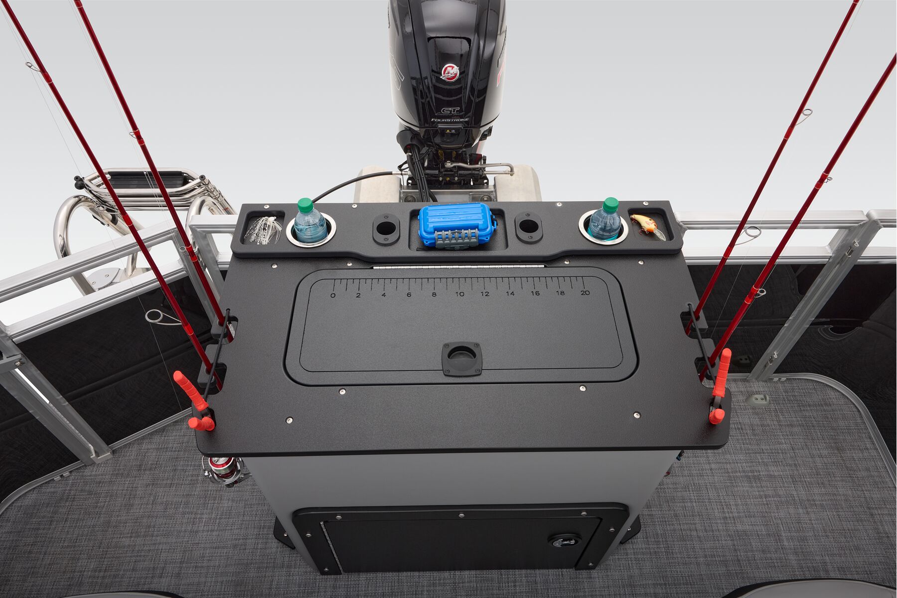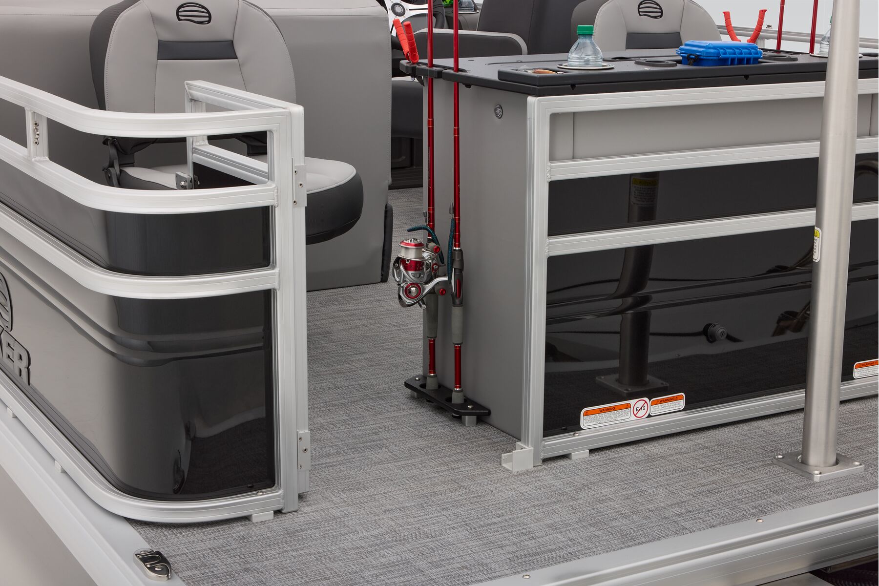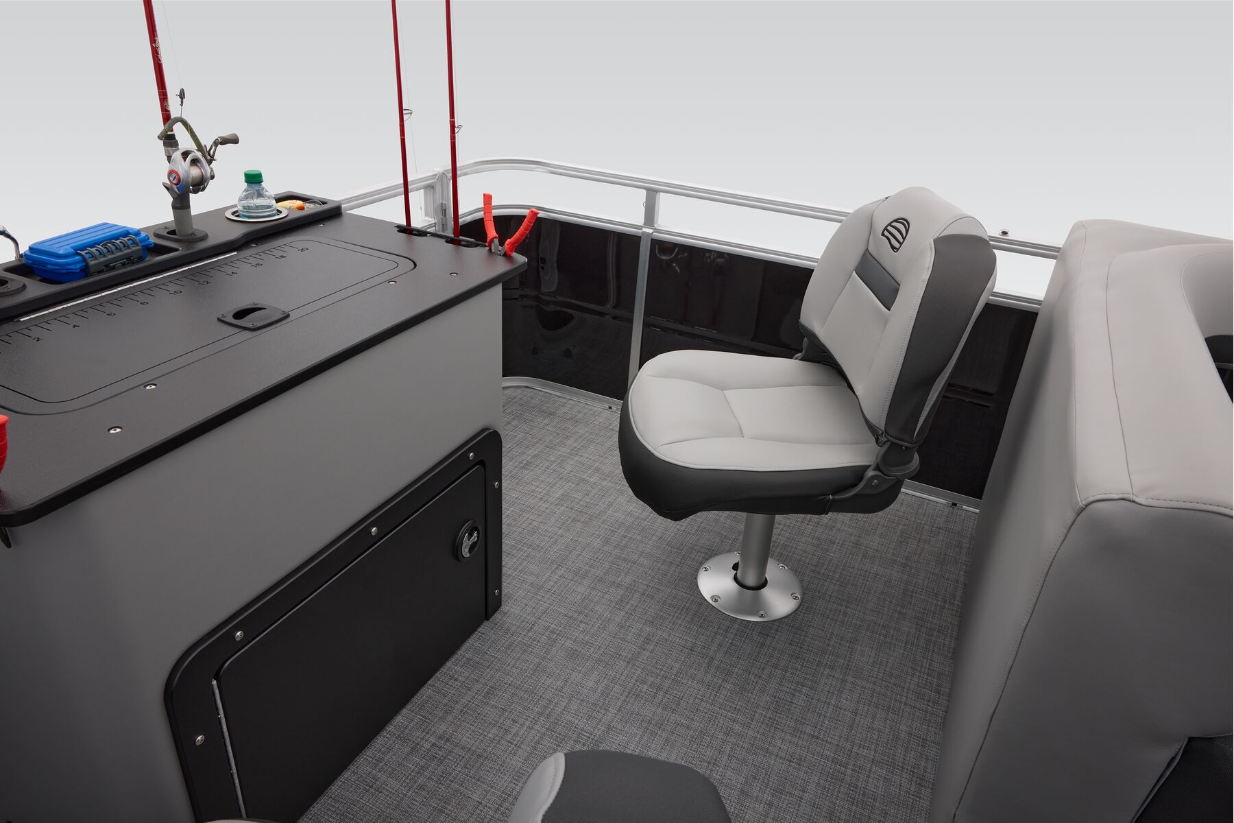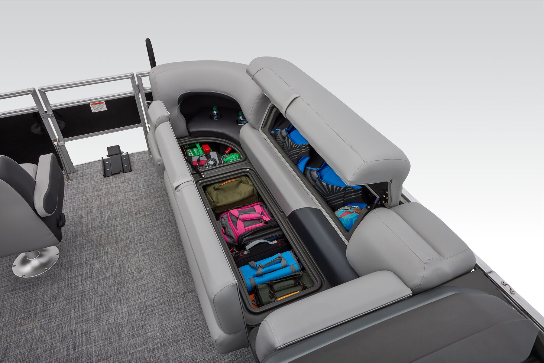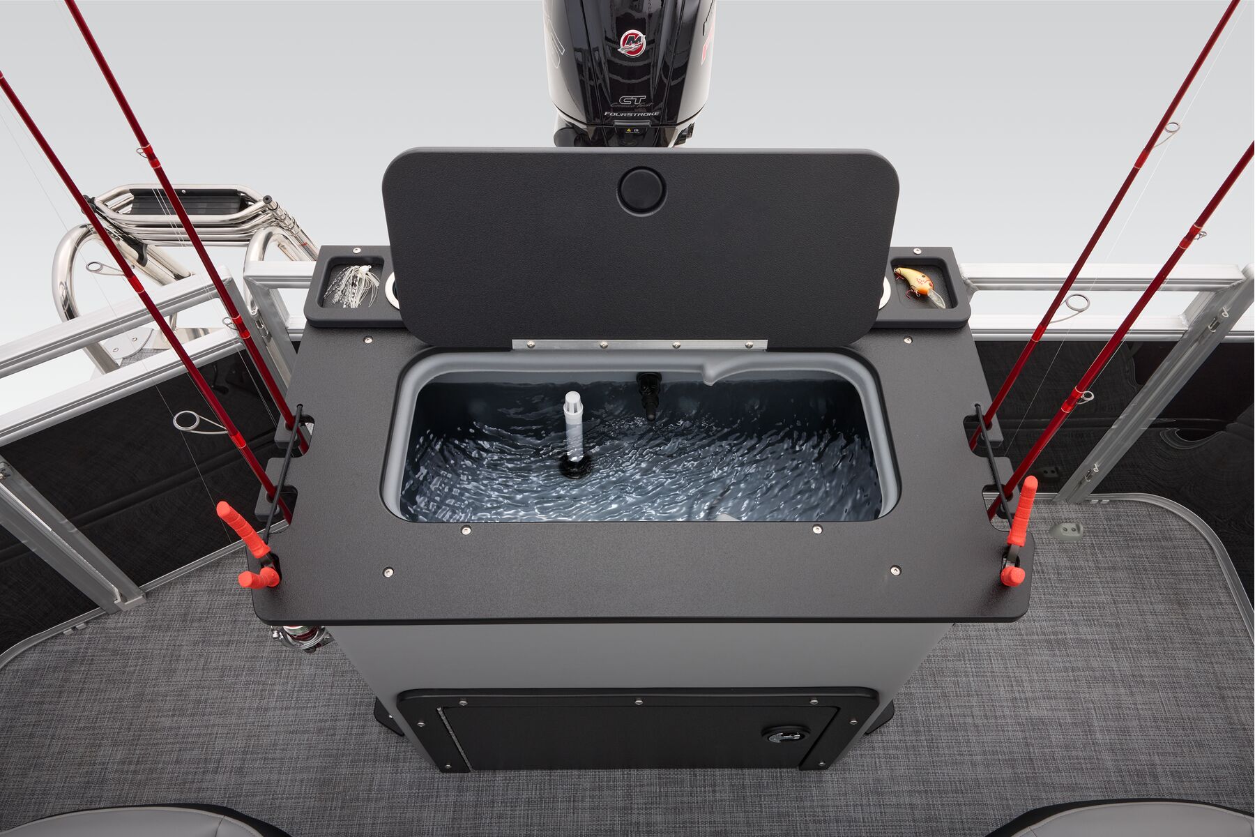 The party for up to 10 people starts with the dual lounges that boast STOW MORE™ compartments for packing and securing supplies. The 2026 model adds a new, wider ladder that makes reboarding easier. The new year also brings cut-out sections in the backrests that give you more cupholders and space for gear. For the anglers, there are swiveling pedestal fishing chairs on both ends of the pontoon and an 8-gal. aerated livewell complete with a rod holder and a composite lid with an integrated fish ruler.