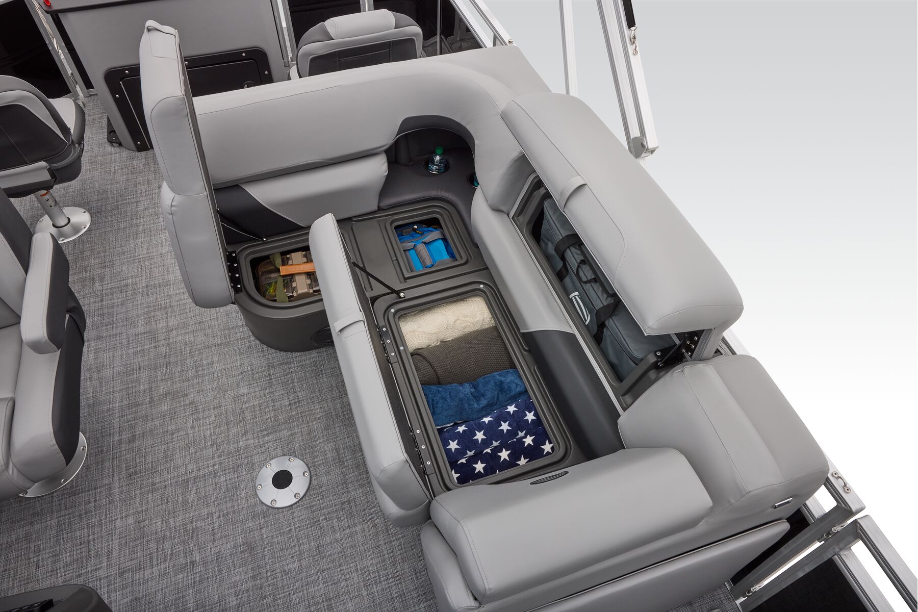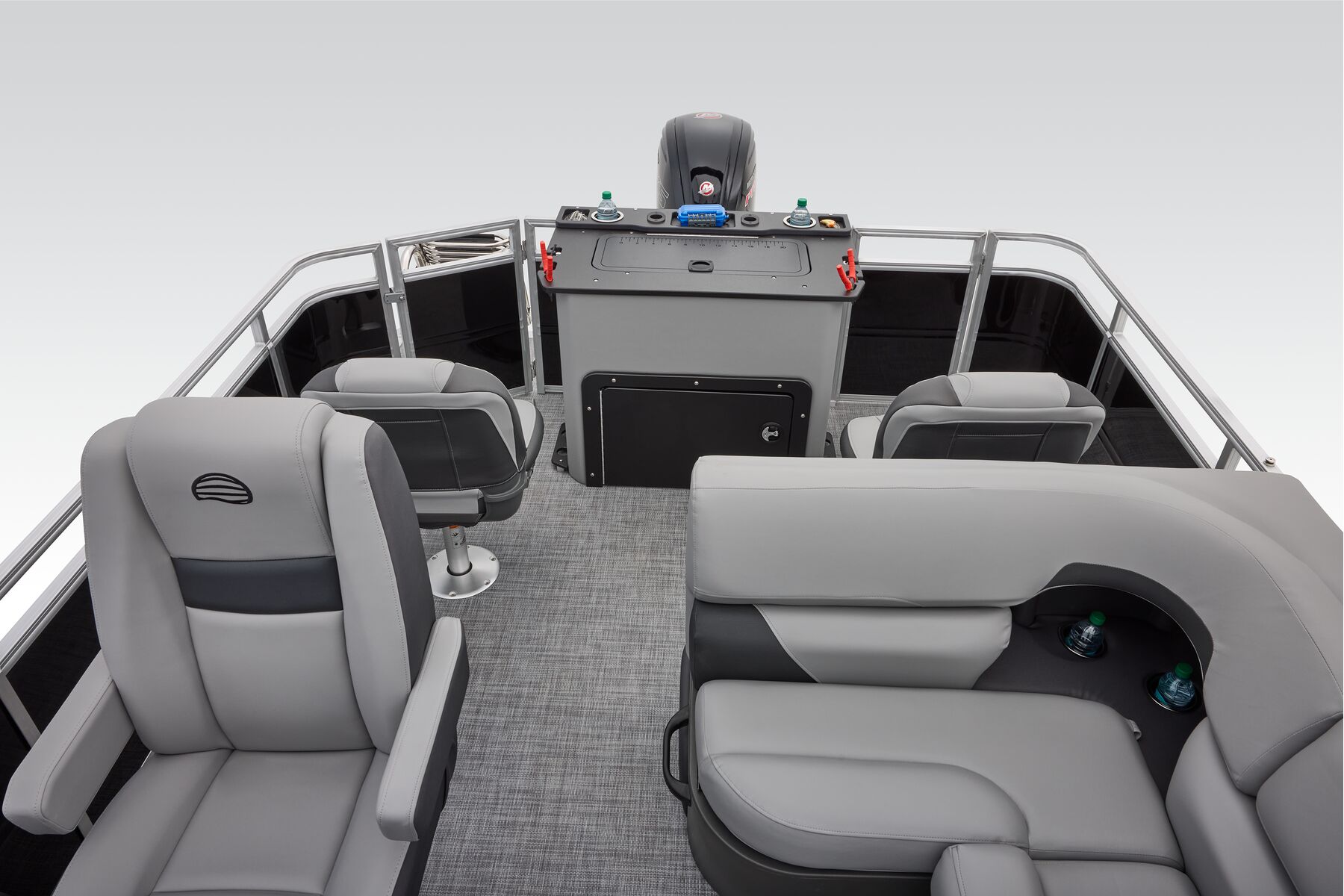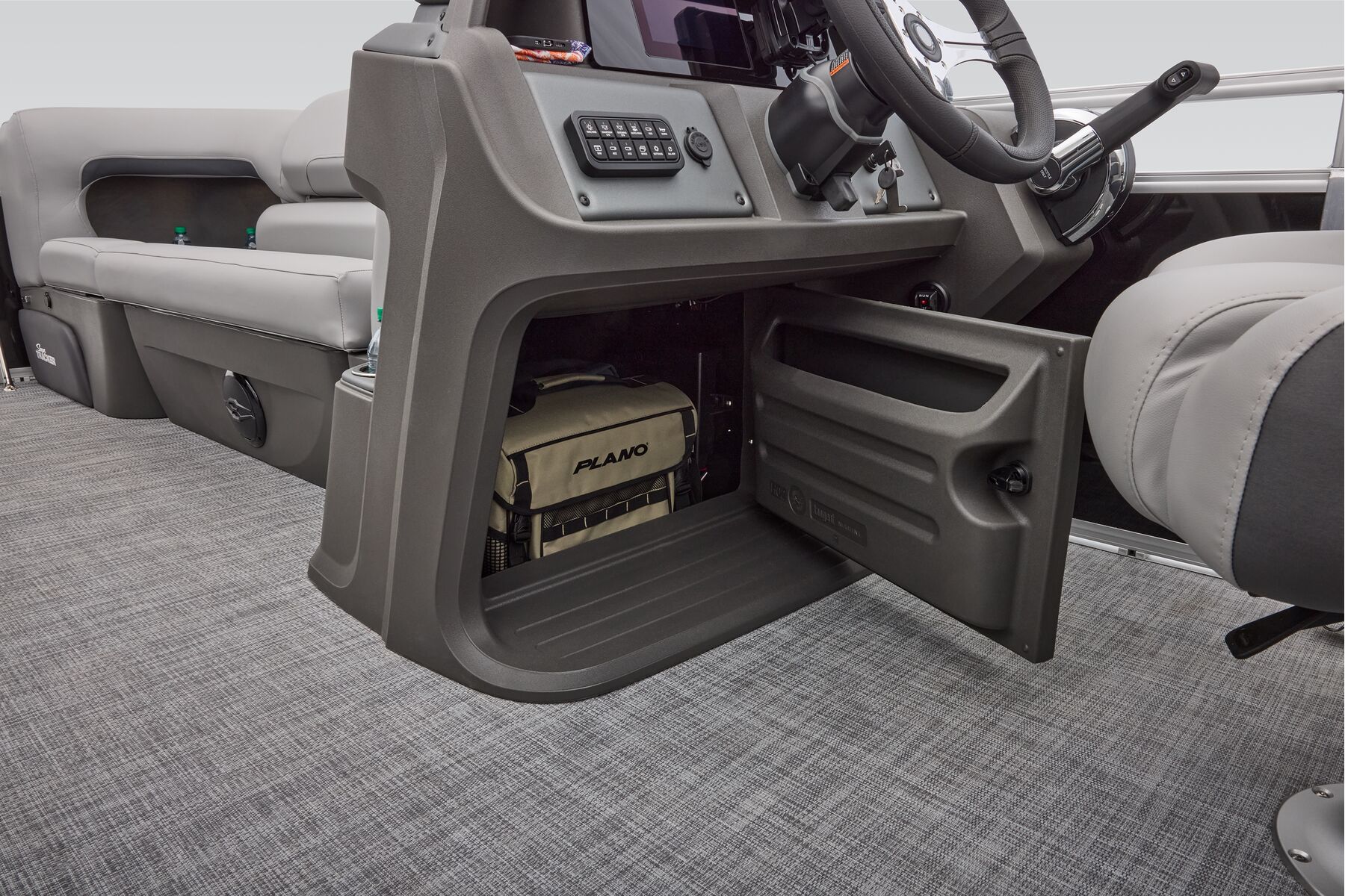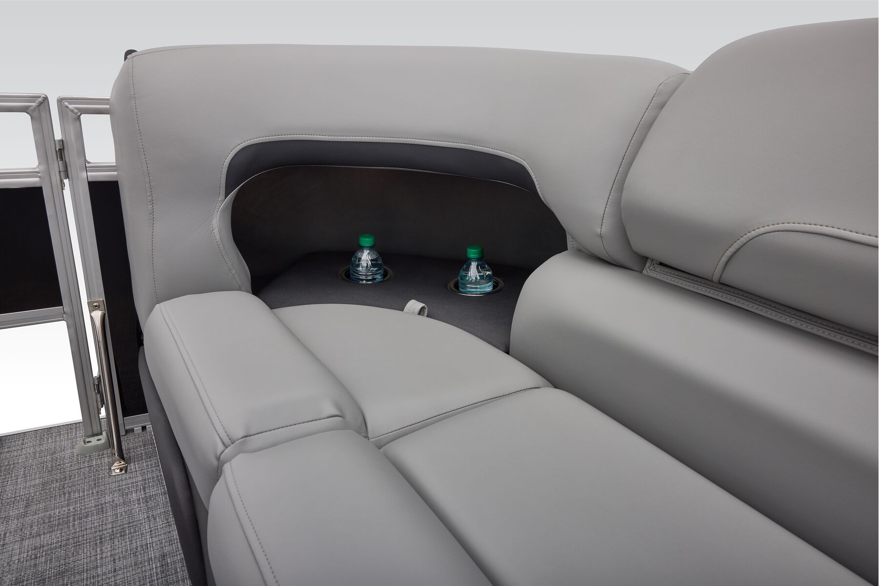 The party for up to 10 people starts with the dual lounges that boast STOW MORE™ compartments for packing and securing supplies. The 2026 model adds a new, wider ladder that makes reboarding easier. The new year also brings cut-out sections in the backrests that give you more cupholders and space for gear. For the anglers, there are swiveling pedestal fishing chairs on both ends of the pontoon and an 8-gal. aerated livewell complete with a rod holder and a composite lid with an integrated fish ruler.