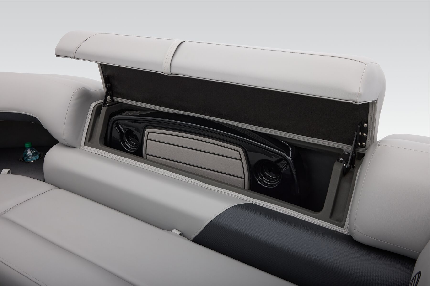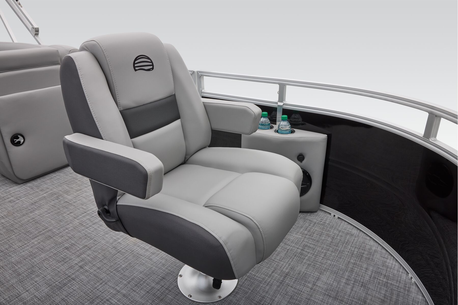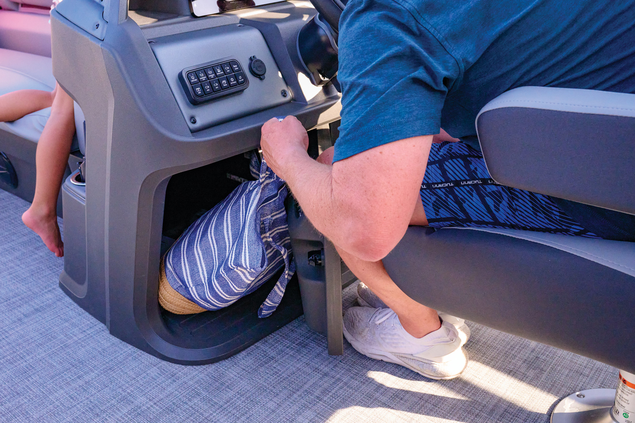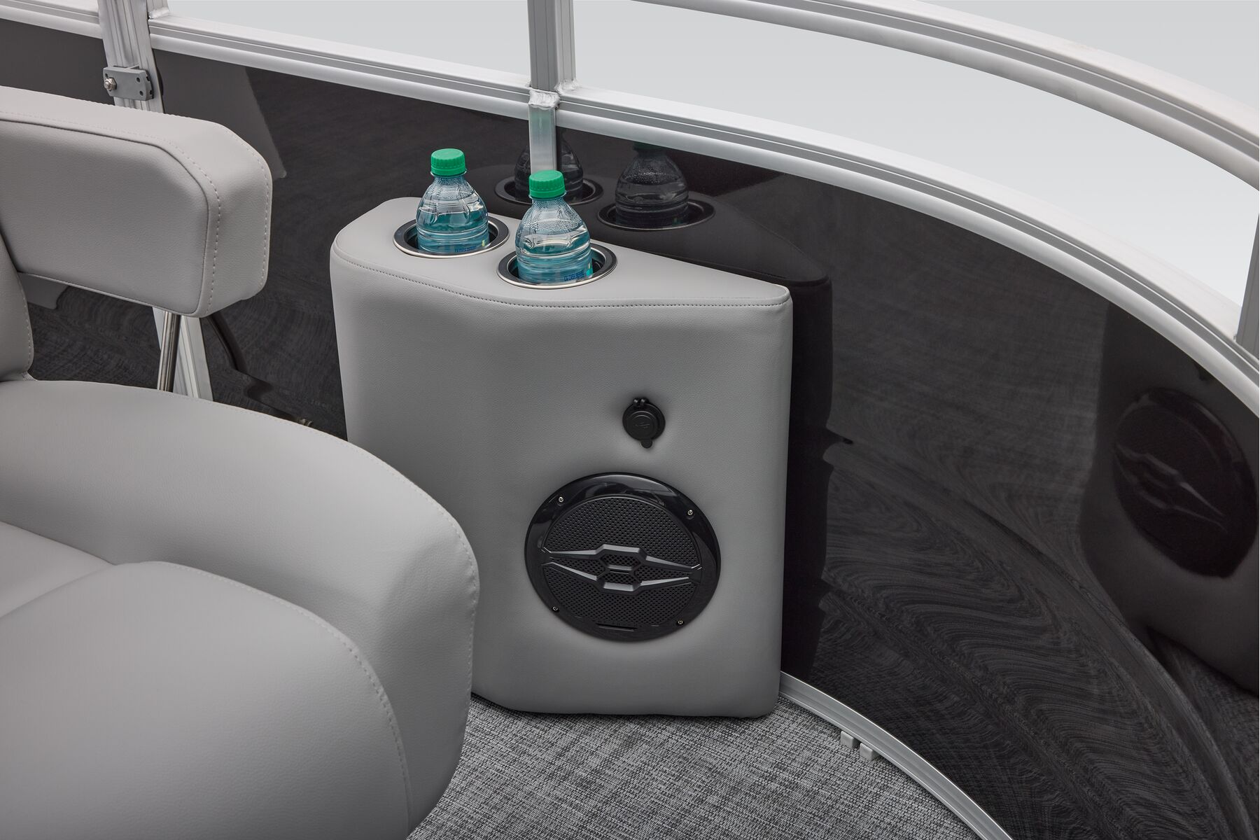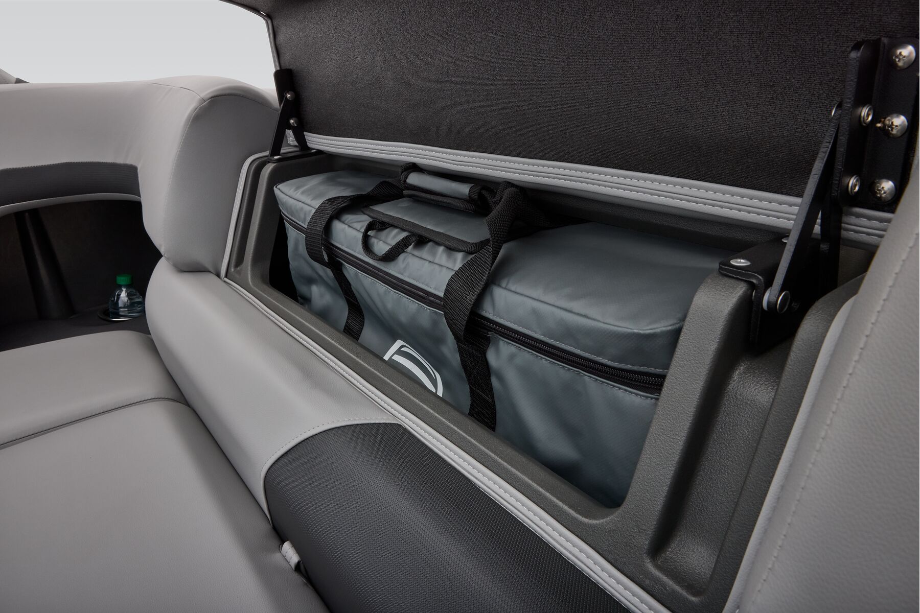 The party for up to 10 people starts with the dual lounges that boast STOW MORE™ compartments for packing and securing supplies. The 2026 model adds a new, wider ladder that makes reboarding easier. The new year also brings cut-out sections in the backrests that give you more cupholders and space for gear. For the anglers, there are swiveling pedestal fishing chairs on both ends of the pontoon and an 8-gal. aerated livewell complete with a rod holder and a composite lid with an integrated fish ruler.