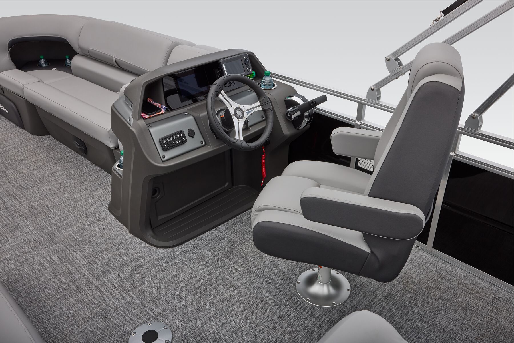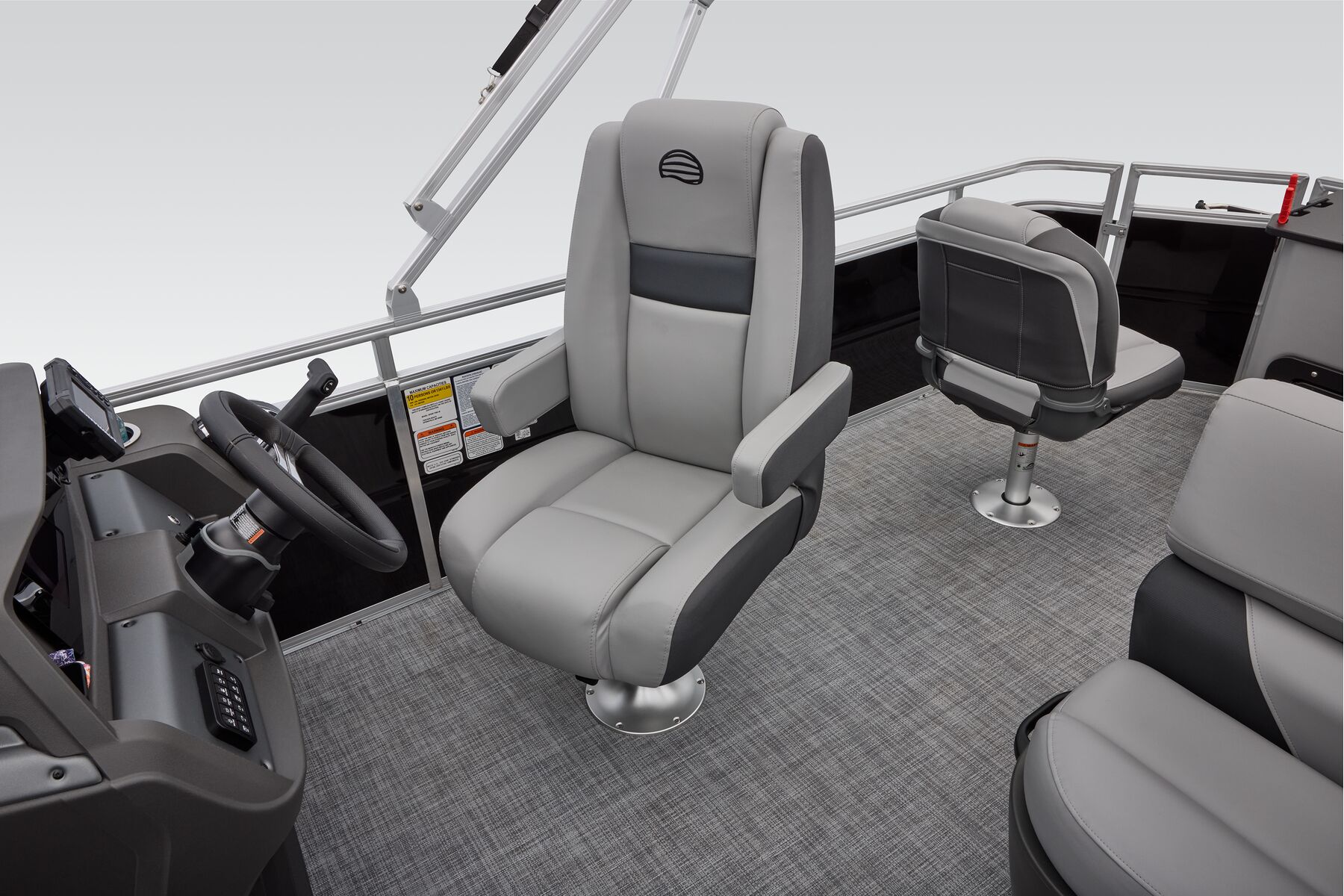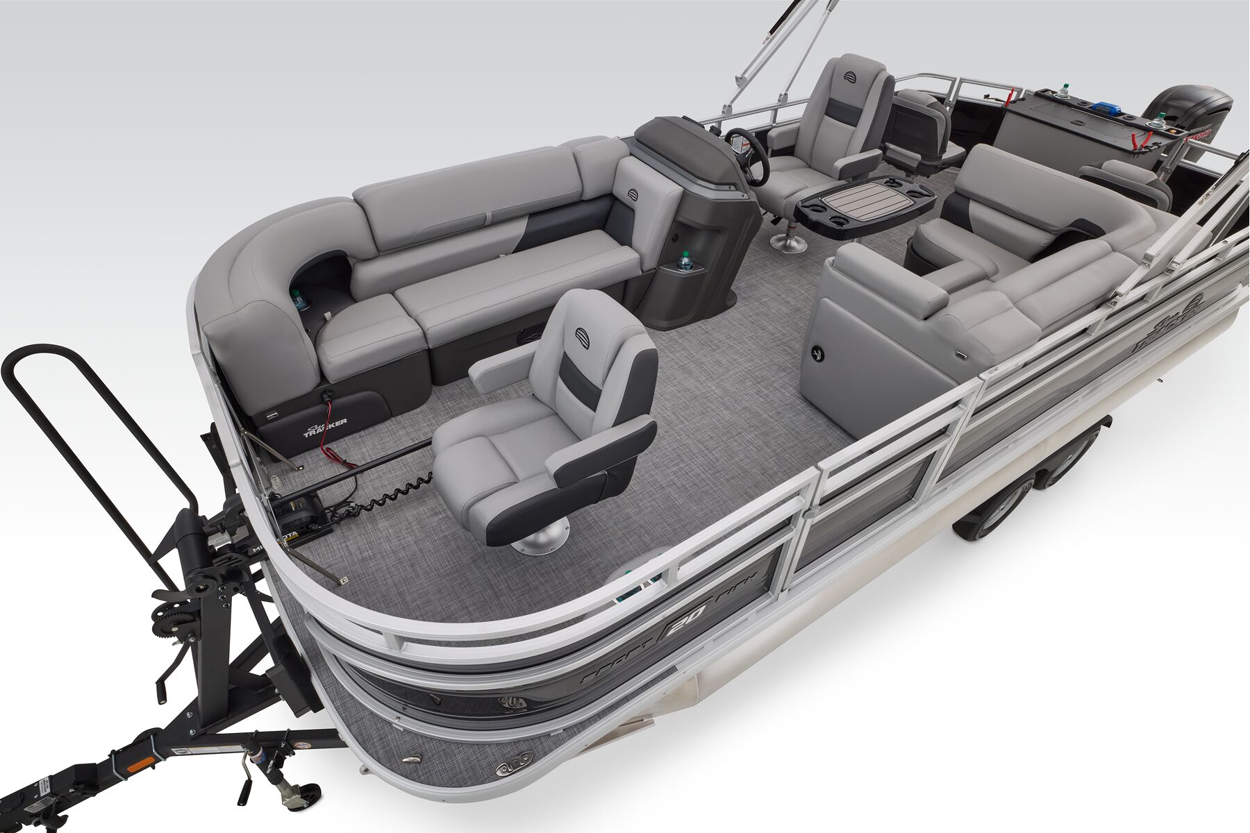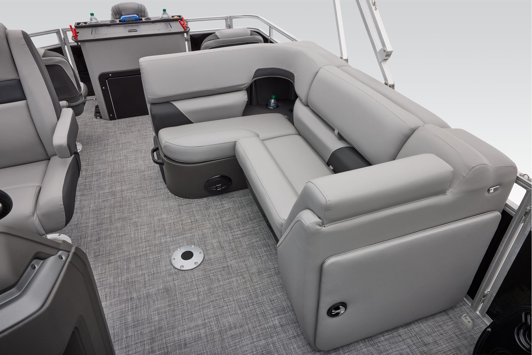 The party for up to 10 people starts with the dual lounges that boast STOW MORE™ compartments for packing and securing supplies. The 2026 model adds a new, wider ladder that makes reboarding easier. The new year also brings cut-out sections in the backrests that give you more cupholders and space for gear. For the anglers, there are swiveling pedestal fishing chairs on both ends of the pontoon and an 8-gal. aerated livewell complete with a rod holder and a composite lid with an integrated fish ruler.