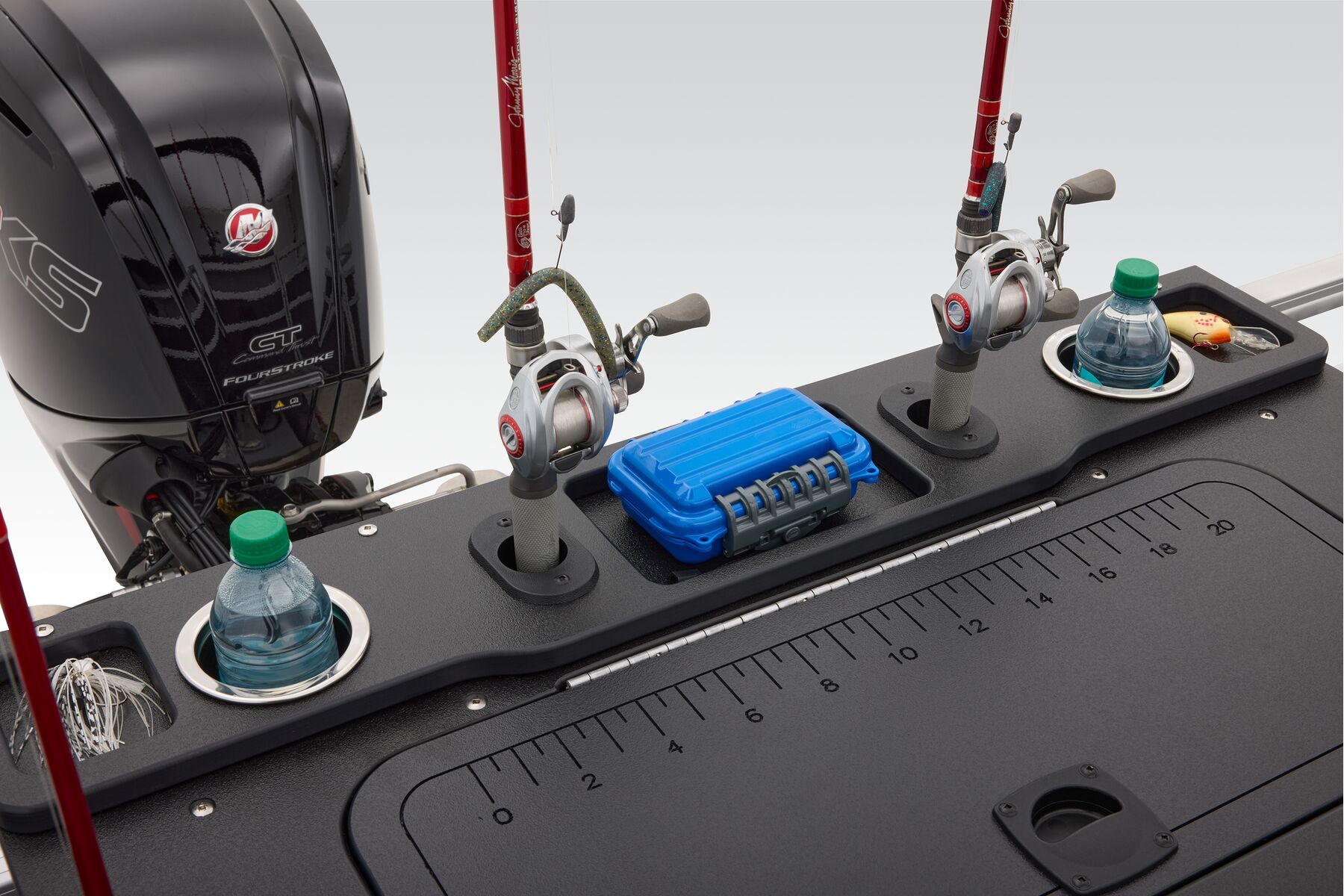 Aft 15-gal. aerated livewell/baitwell with shutoff valve, drink holder, rod holder, and composite lid with fish ruler.