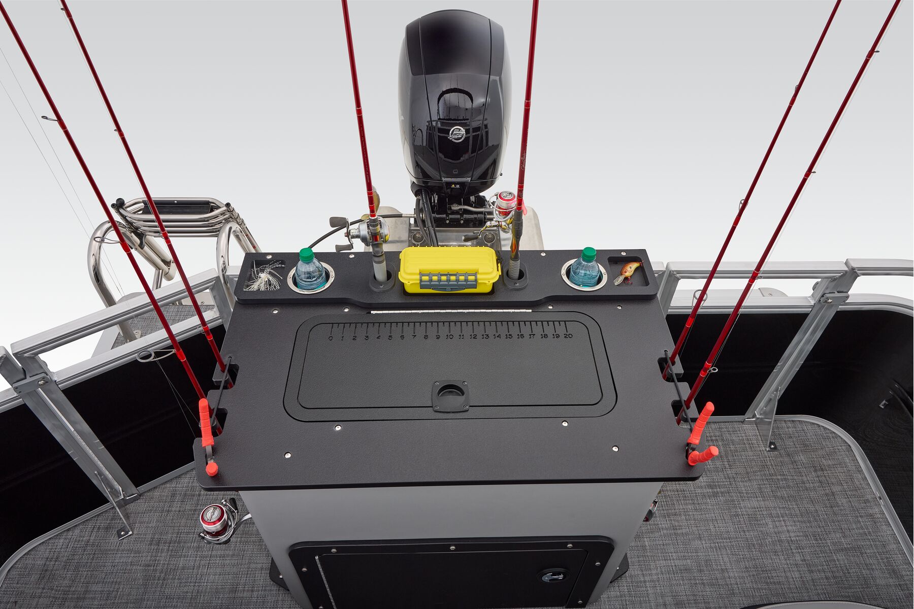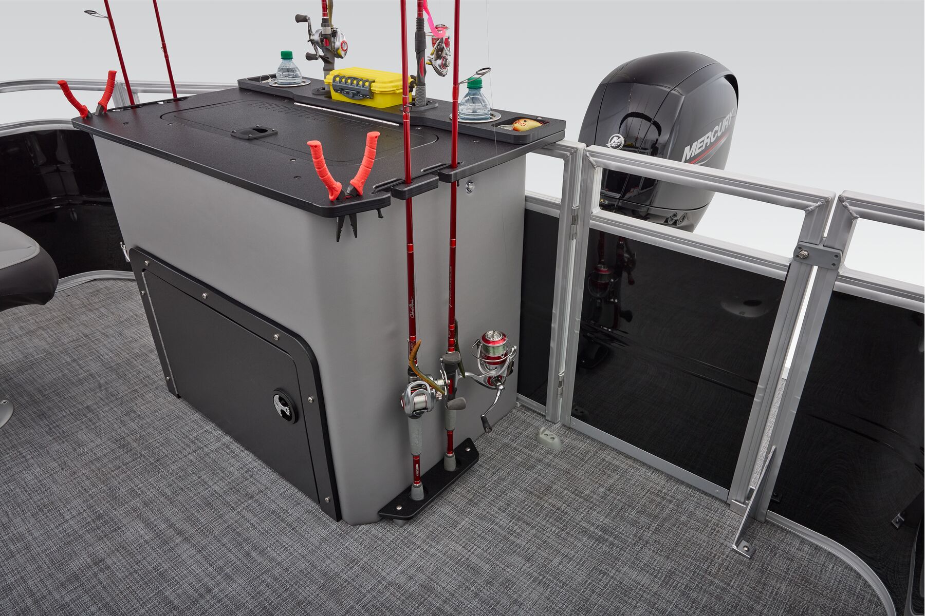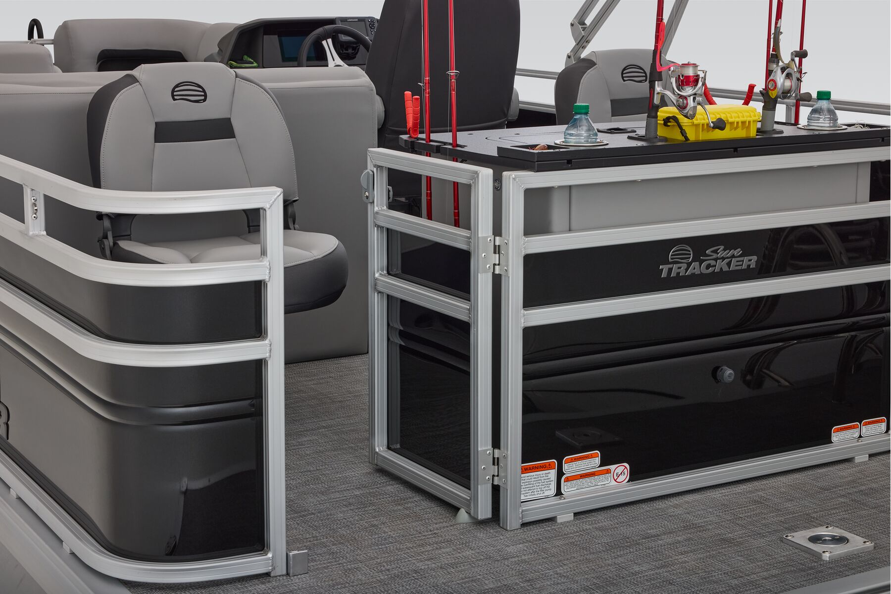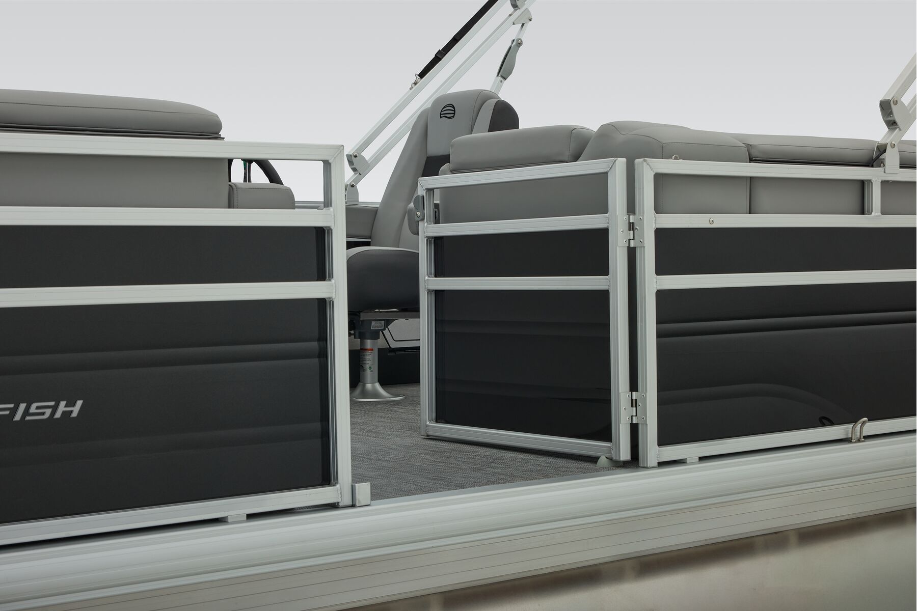 NEW aft fishing station with dual gates, two pedestal seat bases and built-in rod/tool holders.