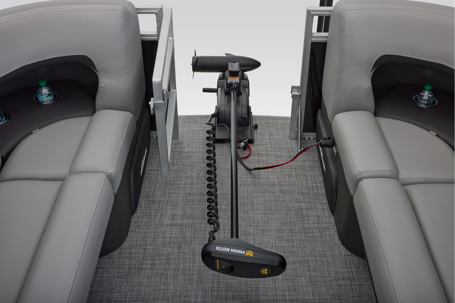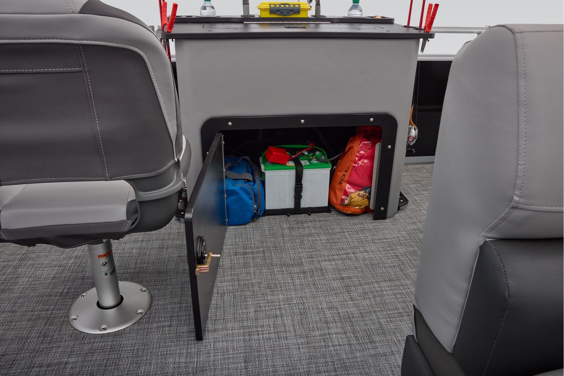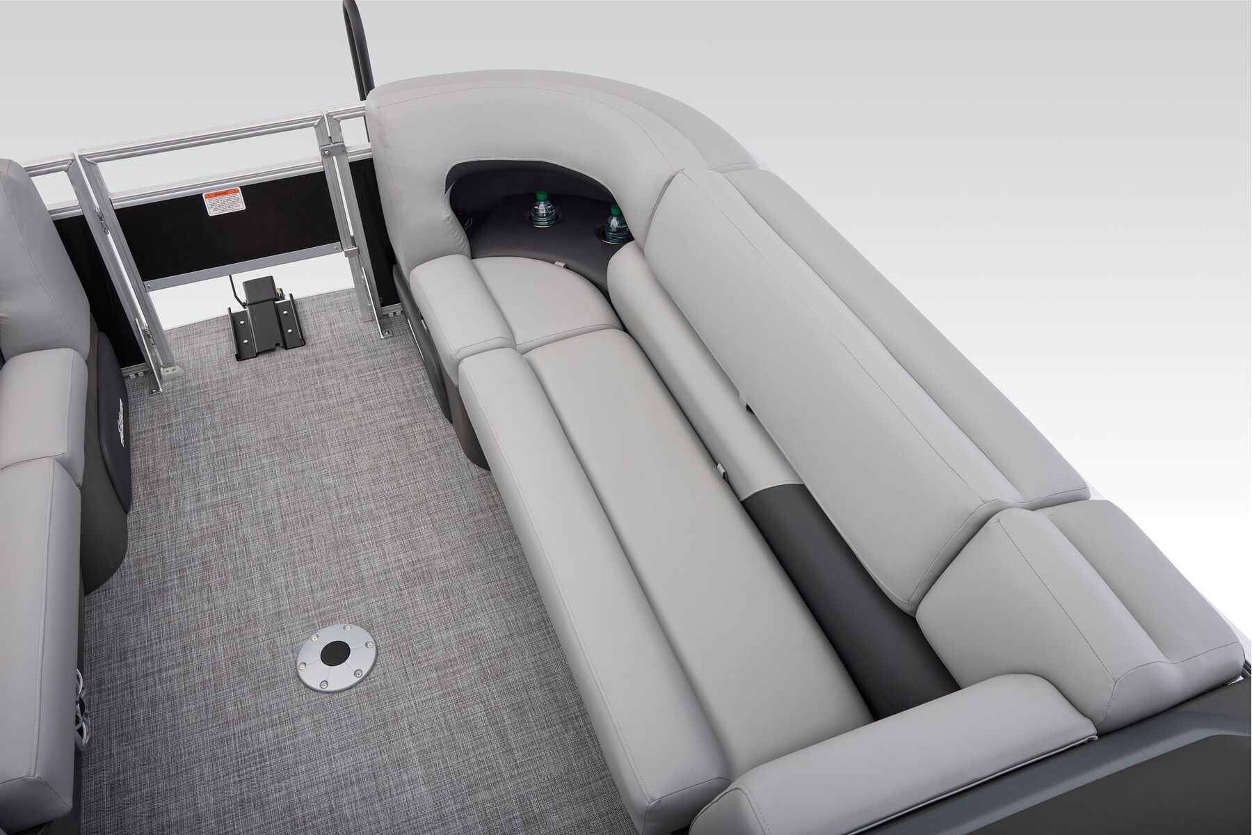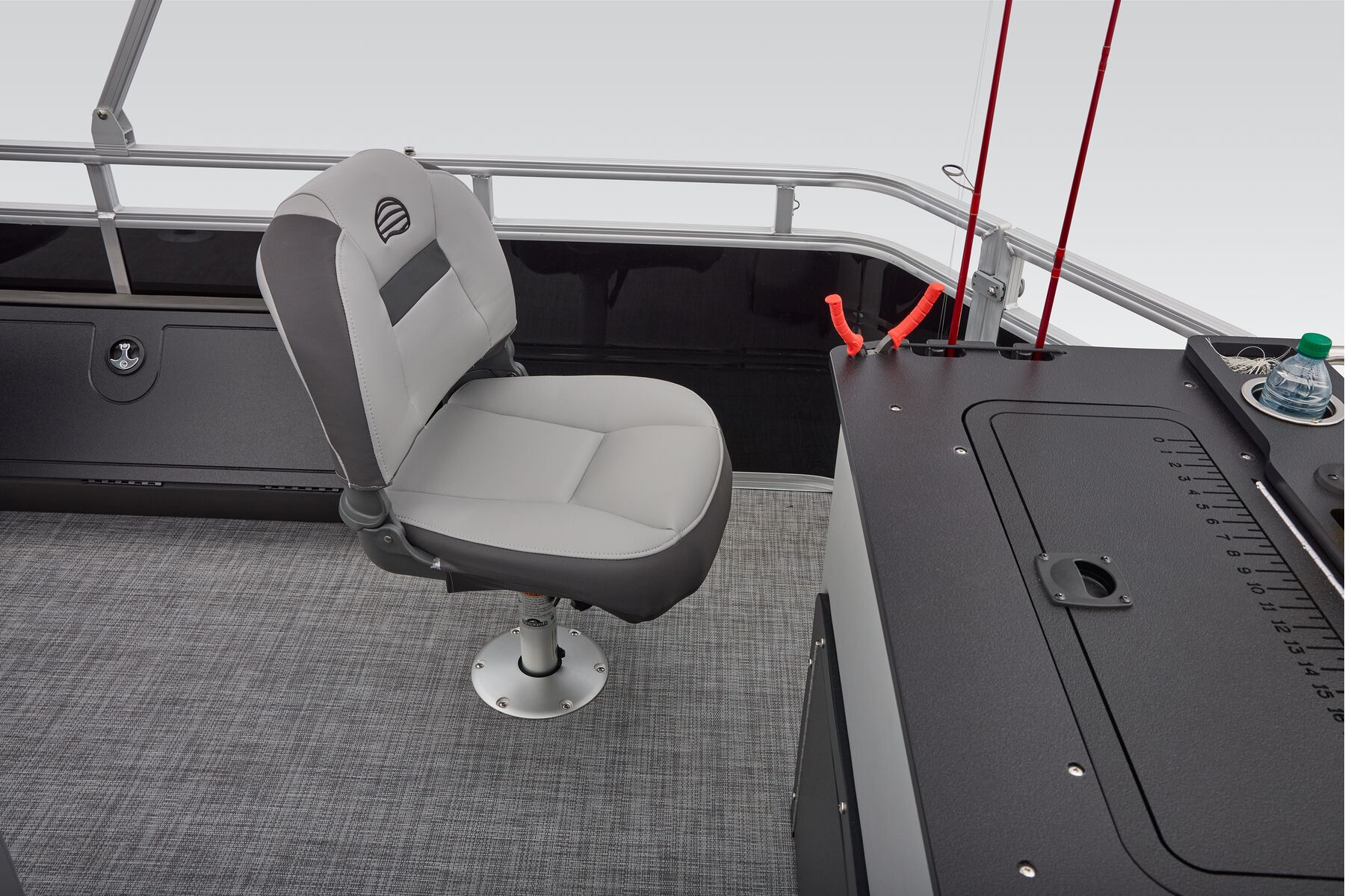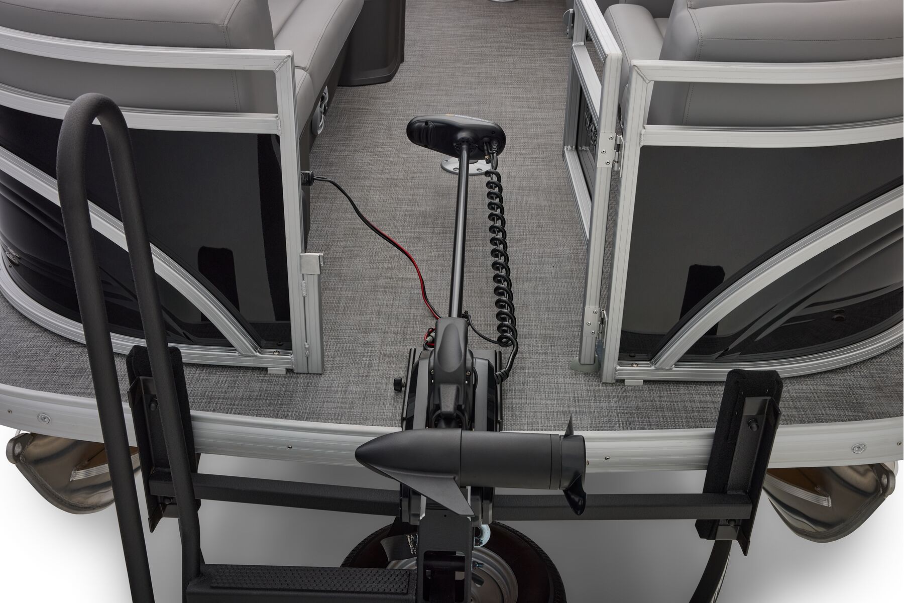 NEW aft fishing station with dual gates, two pedestal seat bases and built-in rod/tool holders.