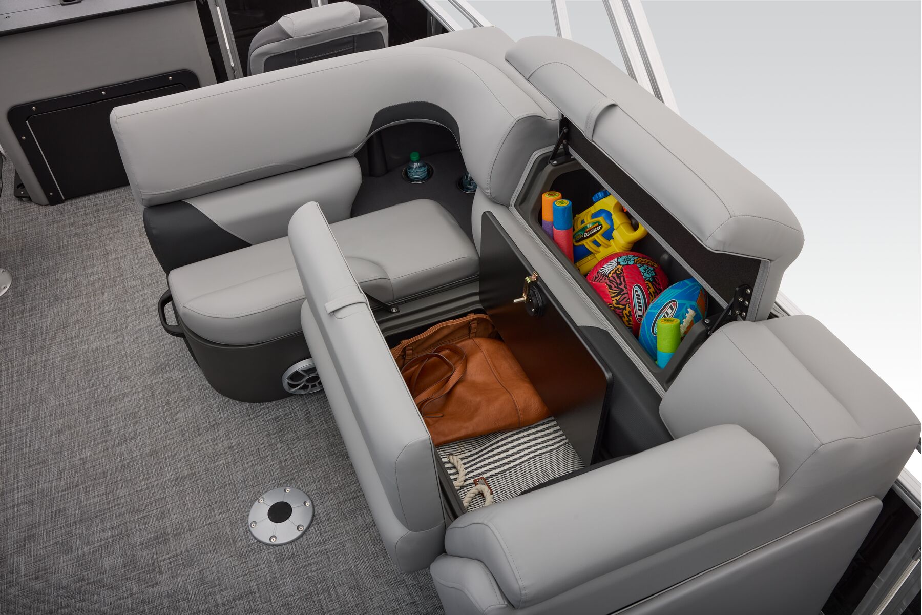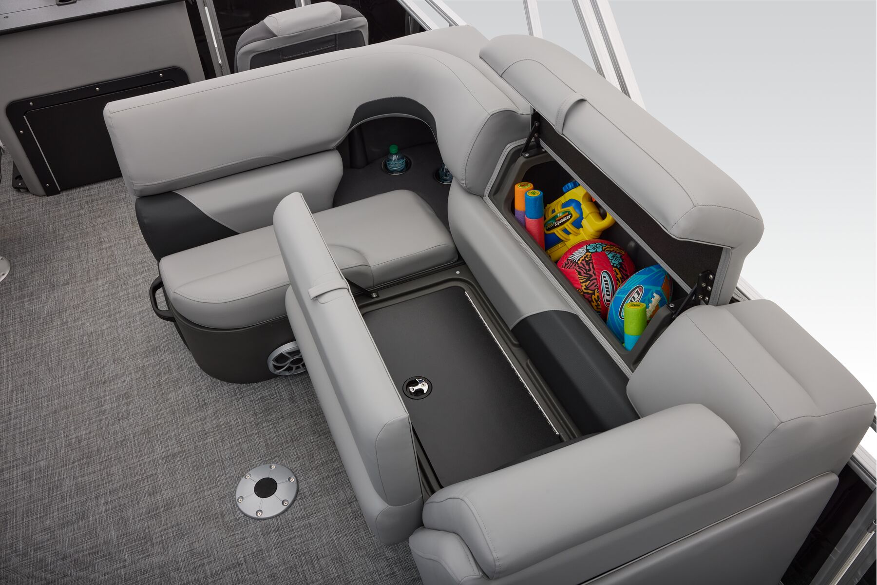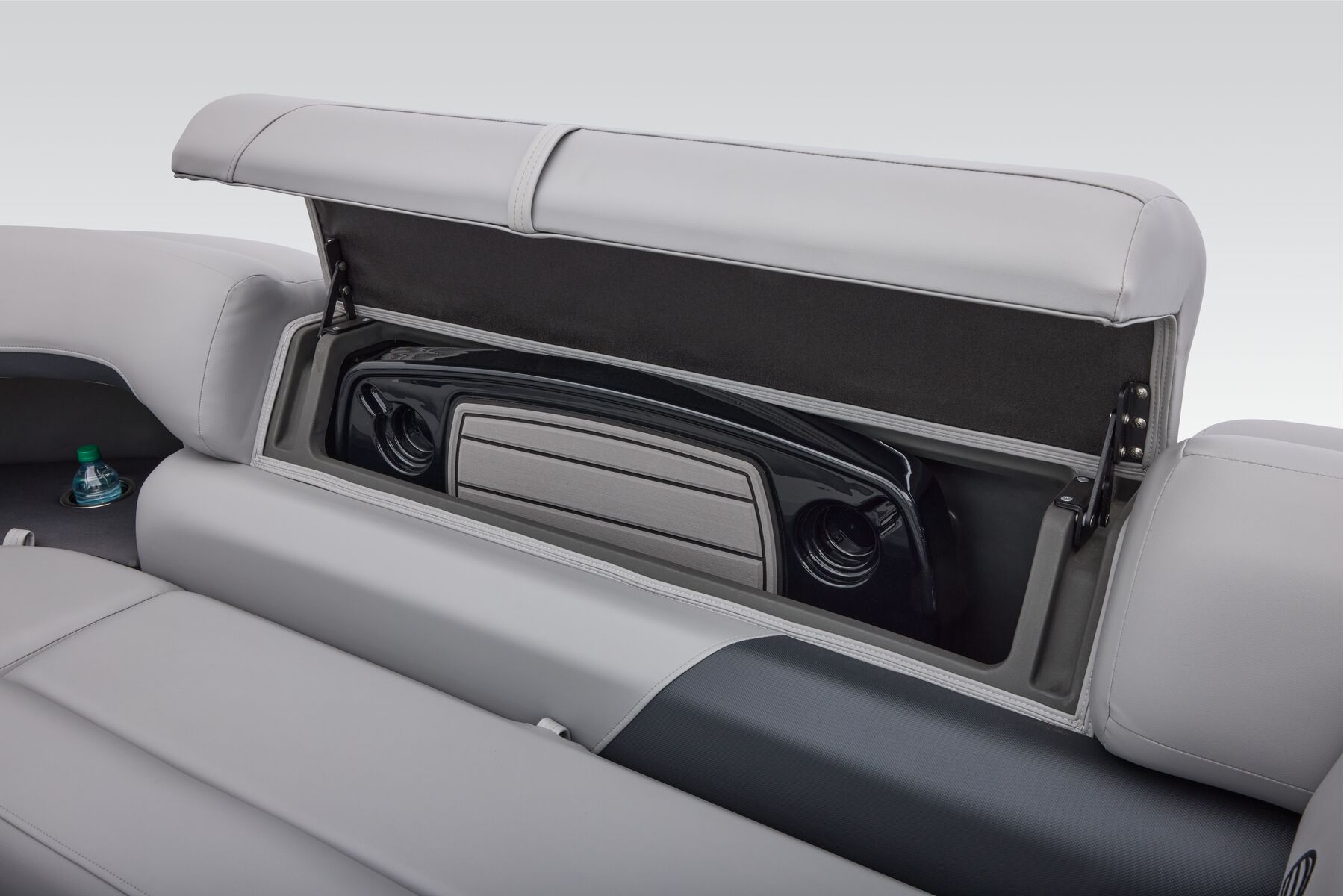 Unlock the rod box—which fits six 7'6" rods—and pull out your favorite combo. Post up in one of the two removable and folding fishing chairs in the aft fishing deck, which boasts a under-couch livewell and tackle storage compartment. Two forward couches and an L-shaped lounge under a standard 10' bimini top provide cool shade and plenty of space to relax. The 2026 model year offers a wider boarding ladder and backrest cubbies with extra storage and cupholders.