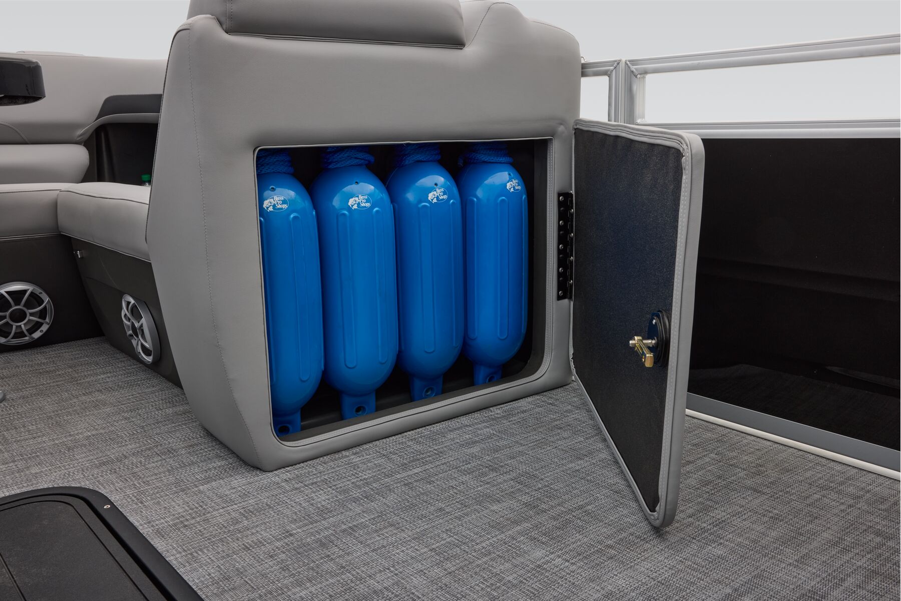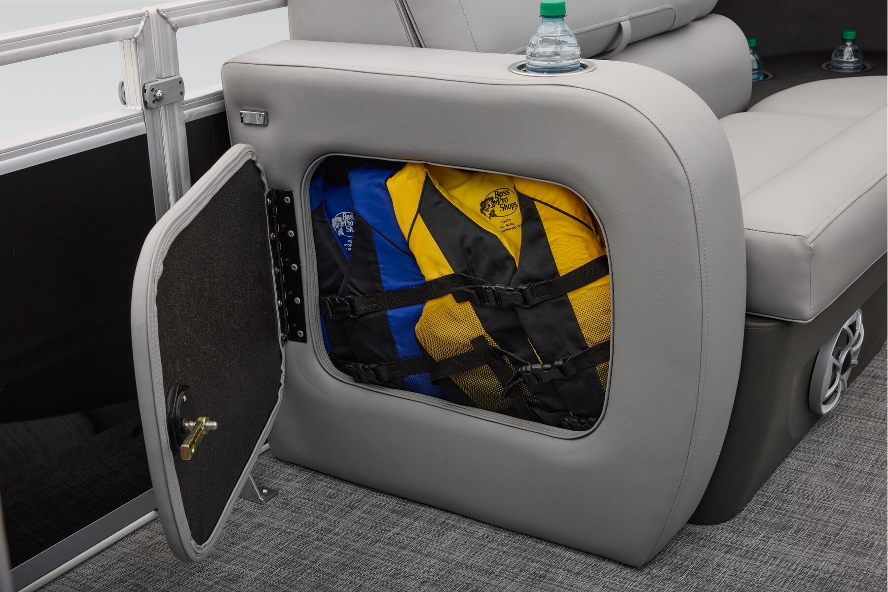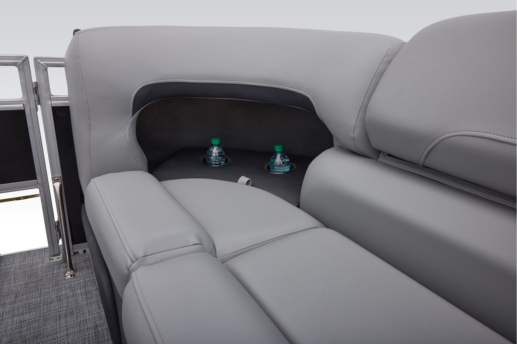 Unlock the rod box—which fits six 7'6" rods—and pull out your favorite combo. Post up in one of the two removable and folding fishing chairs in the aft fishing deck, which boasts a under-couch livewell and tackle storage compartment. Two forward couches and an L-shaped lounge under a standard 10' bimini top provide cool shade and plenty of space to relax. The 2026 model year offers a wider boarding ladder and backrest cubbies with extra storage and cupholders.