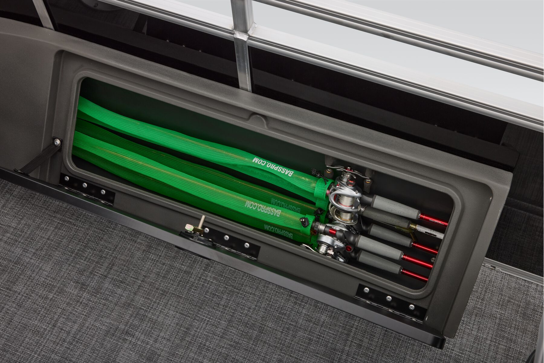 Aft starboard lockable rod box for 6 rods up to 7'6" with lid, rod tube holders & organizer.