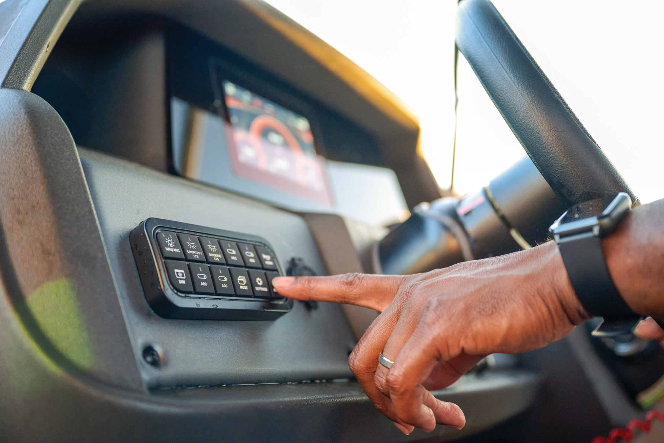 NEW console design with integrated storage, drink holders, built-in footrest & ergonomically-positioned controls.