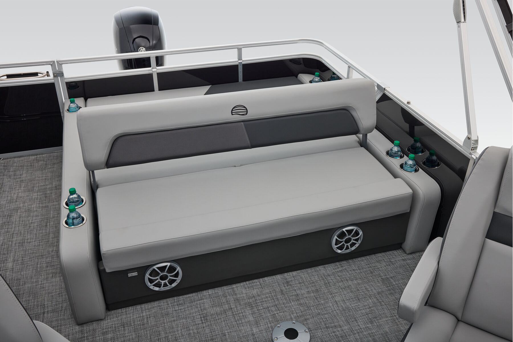 The RF version of the 2026 SUN TRACKER® PARTY BARGE® 22 DLX pontoon switches up the deck configuration in a fun way. You still get four ultra-comfortable lounges in the RF DLX, but the aft port lounge is shortened and pushed forward to make room for a double-wide, rear-facing lounge. Every lounge boasts hidden storage compartments that allow you to pack what you need for today’s trip to the lake.